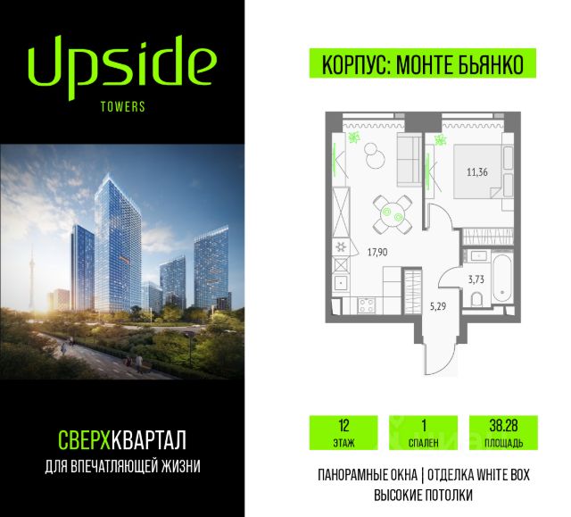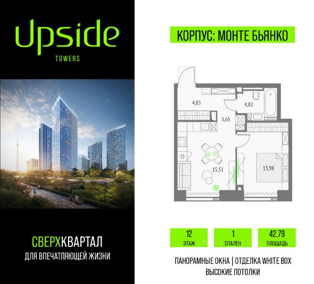 Продаётся 1-комнатная квартира площадью 38.91 кв.м на 12 этаже 46 этажного корпуса Монте Бьянко в квартале небоскребов "Upside Towers". В квартире отделка White-box, c видом на Звездный бульвар, Ольгинский храм, Останкинскую Башню, ВДНХ. Номер квартиры Г1202. Upside Towers - технологичный квартал строится в динамично развивающемся Бутырском районе, в 3 мин. от метро, в 5 мин. от ТТК. На территории 7 га возводится 5 высотных башен от 19 до 58 этажей, названных в честь главных вершин земли. Квартиры с панорамными окнами в пол, высокими потолками и современными инженерными решениями. Благоустроенная зеленая территория включает: приватные дворы, природный комплекс, прогулочный бульвар, ландшафтный парк 2,5 га с сенсорным садом и многофункциональными игровыми и спортивными площадками. В корпусе откроется смотровая площадка для резидентов с панорамными видами на город, парки, Останкинскую башню, ВДНХ, Ботанический сад и Москву-Сити. На первых этажах корпуса Монте Бьянко разместятся: фитнес студия, салон красоты, центр превентивной медицины, образовательные классы, книжный магазин, аптека, фермерская лавка, а также келлеры для хранения сезонных вещей. В приватном закрытом дворе разместятся разнообразные площадки для прогулок, игр и отдыха. Визитной карточкой двора станет уникальная биометрическая игровая пещера со сказочными тоннелями, горками и космическими "мягкими" камнями с неизведанных планет. Планету Земля дети смогут исследовать в павильоне круглый год: объемная крыша укроет от солнца и дождя. Игровая пещера будет реализована в стиле "эмоциональная архитектура". Большое внимание в проекте уделяется созданию социальной инфраструктуры. В стилобатной части, между корпусами "Атлас" и "Олимп" разместится уникальное пространство закрытый клуб для жителей квартала Upside Club площадью 2 000 кв. м. Здесь разместятся: каминный зал с роялем, многофункциональная детская зона c двухуровневым игровым оборудованием для малышей и дошкольников, плей-рум для подростков, домашний кинотеатр, коворкинг, переговорные и лектории. На 47 этаже башни "Атлас" откроется SKY SPA Relax с расслабляющей атмосферой, джакузи, сауной, залами для релаксации и йоги. Собственники квартир смогут в любое удобное для них время забронировать посещение спа-зоны через смарт-приложение. На крыше стилобата разместится всесезонная BBQ патио-зона с верандой и закрытыми помещениями для приготовления и отдыха. Покупая квартиру даже самого минимального размера в Upside Towers, вы получаете в пользование 2 000 м² бесплатных общественных пространств. В рамках проекта строится государственная школа и детский сад, разместится более 15 000 кв.м. коммерческой инфраструктуры. Насыщенная социальная инфраструктура формирует множество сценариев для жизни на территории квартала. В Upside Towers применяются лучшие технологии и практики, чтобы обеспечить высшее качество жизни: Воздух, не уступающий по качеству горному, обеспечит приточно-вытяжная вентиляция. Пятиступенчатая очистка воды с со