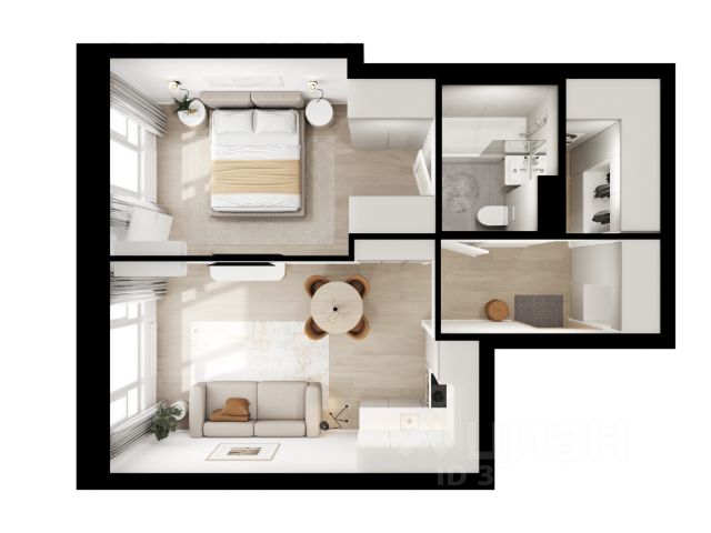 Жилая комната имеет выступ, куда может поместиться кровать. При перепланировке можно увеличить комнату за счет уменьшения коридора.