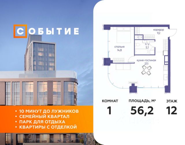 В продаже 1-к квартира от застройщика. Общая площадь 39.30, жилая 14.10, кухня 17.3. Квартира расположена на 12 этаже жилого квартала "Событие-6", корпус 1, Секция 1. Квартира без отделки. Срок сдачи: 4 кв. 2029 года. СОБЫТИЕ.6 — финальный дом парк-квартала СОБЫТИЕ на Мосфильмовской. Переезжайте в уже сформированный квартал с готовой инфраструктурой и парком! Премиальный жилой комплекс в престижном районе Москвы предлагает стильную архитектуру, продуманное благоустройство и великолепно разнообразие общественных пространств. Свой парк прямо возле дома! Архитектура Архитектура СОБЫТИЯ.6 выполнена в ультрасовременном стиле московским бюро Atrium на основе дизайн-кода британских архитекторов LDA Design и UHA London. Дом отличает оригинальная геометрия фасадов, большое остекление и высокие лобби (до 6,2 м) с авторской мебелью и светильниками. Расположение Мосфильмовская улица (Раменки) — один из престижных районов Москвы. Близость к историческому и деловому центру, природным зонам Запада столицы. Транспортная доступность: • 10 мин до Москва-Сити и ТТК; • 15 мин до Садового кольца; • 25 мин до аэропорта Внуково; • 7-10 мин до станций метро "Аминьевская" и "Мичуринский проспект". Инфраструктура: • парк "Событие" (12 га, финалист конкурса Правительства Москвы) с беговыми (1,5 км) и велодорожками (2,7 км), экотропой (1,6 км), площадками, лекторием; • школа, детский сад, магазины, салоны красоты, рестораны (к моменту заселения); • мультидвор с игровыми и спортивными площадками, мини-бульваром; • общественная терраса на 10-м этаже (коворкинг, лаунж); • Закрытые общественные пространства: детская комната, спортивный зал, коворкинг, лаунж-зоны. Паркинг 256 мест для жителей (48 — для электромобилей), 24 гостевых (5 — для электромобилей), мойки колес, кладовые, зоны для велосипедов. Окружение Парки и заповедники (Воробьёвы горы, Матвеевский лес и др.), МГУ, театр им. Н. И. Сац, стадион "Лужники". Безопасность Видеонаблюдение, контроль доступа, видеодомофоны, консьерж-сервис 24/7, системы пожарной безопасности и мультисервисная оптическая сеть.