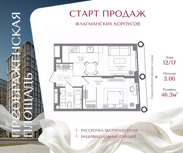 Рассрочка 0% с первоначальным взносом от 20% Квартира на 12 этаже в жилом комплексе премиум-класса "Преображенская площадь". Общая площадь: 45.5 кв.м. Проект премиум-класса в историческом районе Москвы. До метро "Преображенская площадь" 3 минуты пешком. Квартиры сдаются без отделки и в свободной планировке, чтобы жители могли оформить пространство с учетом своей индивидуальности. Высота потолков от 3,15м, широкоформатное остекление, 3-5 квартир на этаже. Система Умный дом. Дизайнерские лобби. Внутренний двор 1,5 га функциональное и безопасное пространство для игр, работы и занятий спортом. Пешеходный променад для прогулок. Дома переменной этажности. Есть подземный паркинг. Жилой комлекс находится в окружении парков Сокольники, Черкизовский, Измайловский, заповедника Лосиный остров и ВДНХ, а также вблизи пешеходной набережной. Комфортная удаленность от центра: 7 минут на автомобиле до ТТК, 8 минут до Садового кольца, 25 минут до Кремля.