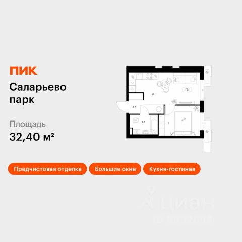 Продаётся 1-комн. квартира площадью 39,3 кв.м на 12 этаже 18 этажного дома (Корпус 74.2, Секция 2) проекта ПИК Саларьево парк. Светлый просторный подъезд на уровне земли, функциональная планировка, большие окна, предчистовая отделка. Жилой район "Саларьево парк" расположен в Новой Москве, в четырёх километрах от МКАД по Киевскому шоссе. Две станции метро: "Саларьево" и "Филатов луг", — находятся в пешей доступности от проекта. Дойти до них можно за 510 минут. В квартале уже создана качественная среда, где есть абсолютно всё для полноценной жизни, работы и отдыха. Благодаря удобному расположению проекта всё важное будет рядом: детские сады, школы, кафе и рестораны, шопинг в торговых центрах, фитнес и даже аэропорт. Все корпуса в квартале гармонично сочетаются, образуя единую городскую среду. Между собой их объединяет невысокая этажность и натуральная цветовая гамма. Здесь приятно гулять и проводить время на улице всей семьёй. В "Саларьево парке" создана уникальная образовательная среда, включающая в себя шесть школ, рассчитанных на 6 250 учеников. Две из них уже открыты, их посещает 2 300 детей. Также на территории "Саларьево парка" находится 12 детских садов, один из которых с бассейном. Сейчас уже открыты 7 садов. В "Саларьево парке" открыта уникальная игровая площадка — PlayHub "Оригами". Здесь есть ручей, горка-труба и рельефные холмы. Взрослые смогут отдохнуть в уютном кафе, пока дети играют. Также на территории проекта есть SportHub — большая спортивная зона, разделённая по интересам и возрастам. Здесь можно заниматься разными видами спорта: футболом, баскетболом, волейболом и стритболом. Зимой центральную часть площадки превращают в каток. Во дворах-парках жилого квартала есть места для отдыха, детские и спортивные площадки. На первых этажах домов расположены магазины, кафе и полезные сервисы. Также вблизи проекта есть несколько масштабных торговых центров. До ТЦ "Саларис" пять минут пешком, до "Рио", Metro Cash & Carry и "Леруа Мерлен" — пять минут на автомобиле. Артикул 1006403 (Застройщик ООО "Специализированный Застройщик "Тирон")