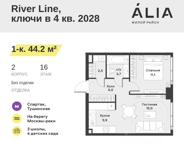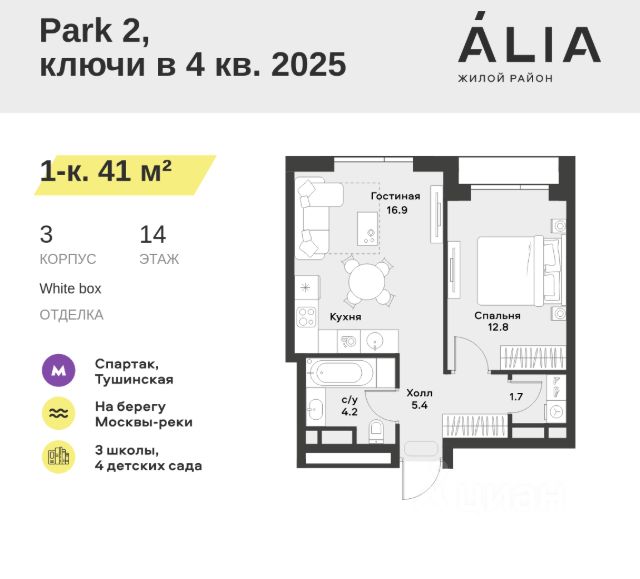 Продаётся 1-комнатная квартира 41 м². В жилом районе Алиа на 12-м этаже 28-этажного дома. Жилой район Алиа — это дома бизнес-класса у слияния Москвы-реки и Сходни. Алиа находится в Покровском-Стрешневе, экологически чистом районе на престижном северо-западе столицы. Район возводится на бывшей территории Тушинского аэрополя, где никогда не было промышленного производства. Алиа — это район разностороннего развития, спроектированный по принципу WORK.LIVE.PLAY.LEARN. Это "15-минутный город", где вся необходимая для комфортной жизни инфраструктура — на расстоянии приятной прогулки. У района удобное расположение: отсюда меньше 10 минут пешком до станций метро "Спартак" и "Тушинская" и всего полчаса на автомобиле до центра города или аэропорта Шереметьево. Архитектурную концепцию Алиа разработало бюро SOM (Skidmore, Owings & Merrill), авторы знаменитой "Бурдж-Халифа". В Алиа больше 140 планировочных решений, среди которых — редкие для Москвы форматы: квартиры с окном в ванной, пентхаус, сити-юниты и таунхаусы. Почти половина территории района отдана под благоустройство. В Алиа три парка: Линейный парк с кафе и магазинами, Центральный парк с амфитеатром, сухим фонтаном и большим плейхабом для детей всех возрастов и Прибрежный парк на собственной набережной, одной из самых длинных в Москве. В каждом урбан-блоке — закрытый внутренний двор с гипоаллергенными растениями и детской площадкой. В лобби каждого жилого корпуса в Алиа оборудована зона ожидания, колясочная, гостевой санузел и лапомойка для домашних животных. За стойкой ресепшена резидентов и их гостей встречает консьерж. Центральное лобби урбан-блока — это стильное общественное пространство с коворкингом, лаундж-зоной и кофе-пойнтом. Это "вторая гостиная" жителей урбан-блока и одно из мест, где формируется комьюнити Алиа. Два ключевых объекта инфраструктуры в Алиа — это спорткомплекс "Чкалов Арена", где представлены 25 видов спорта, и самый большой в стране бизнес-парк класса A, благодаря которому району обеспечено быстрое развитие.