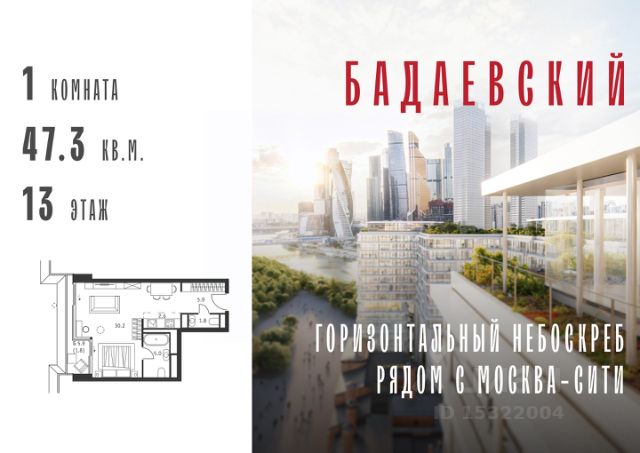 Продаётся 1-комнатная квартира общей площадью 55.10 м² на 13 этаже Жилого Комплекса Бадаевский. О нем говорили. Его ждали. Жилой комплекс "Бадаевский" на Кутузовском проспекте — это место для жизни, которое займет место в истории. Комплекс стал первым в истории московским проектом, победившим в категории Residential на World Architecture Festival. Девелопер Capital Group. В "Бадаевском" исторические здания завода и футуристические "парящие" дома создают единый комплекс, который станет новой достопримечательностью и символом Москвы. Панорамное остекление, террасы и веранды дарят неординарные и захватывающие виды. Благодаря расположению домов и панорамному остеклению, жилые пространства в "Бадаевском" будут наполнены светом. А виды из окон домов-"лент" на Москву-реку, пивоваренный завод, небоскребы "Москва-Сити" и Белый дом дополнены принципиально новым ощущением высоты. На территории Бадаевского завода появится масштабный ландшафтный парк с концепцией "русский лес". Впервые в истории района Дорогомилово у жителей появится прямая связь набережной Тараса Шевченко с Кутузовским проспектом. Близость Москвы-реки добавляет к преимуществам "Бадаевского" природную энергетику и приятные прогулки на свежем воздухе. Подземная парковка позволит сделать территорию завода полностью пешеходной, а сам комплекс представит новый подход к организации открытого и уединенного пространства в центре Москвы. Расположение в начале Кутузовского проспекта делает проект не только престижным, но и удобным: до Третьего транспортного и Садового кольца можно доехать за 5 минут, а Кремль и основные исторические достопримечательности расположены в 15 минутах на автомобиле. Напротив "Бадаевского" находится офисный кластер "Москва-Сити". Для жителей комплекс будет создано не только новое масштабное благоустройство, но и вся необходимая инфраструктура. В исторических корпусах появятся магазины, бутики, кафе и рестораны, коворкинг и крафтовая пивоварня, а в зданиях элеваторов — русская баня. Кроме того, запланирован фермерский рынок и досуговый кластер с музыкальной студией, центром детского творчества и фитнес-центром с бассейном.