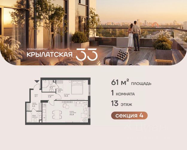 Продается 1-к квартира площадью 49.2 кв.м. на 13-м этаже в ЖК "Клубный квартал Крылатская 33". Прямая продажа от застройщика! Крылатская 33 - проект премиум-класса на западе Москвы от специализированного застройщика "Сияние". Комплекс расположен всего в 15 минутах от Садового кольца и Москва-Сити, а рядом есть большое количество зелёных зон: Крылатский и Москворецкий парки, Серебряный бор, Крылатские холмы - это создает идеальный баланс между приватностью и динамичным ритмом мегаполиса. Квартал сочетает высотные башни до 150 метров и камерные малоэтажные корпуса. Витражное остекление "в пол" наполняет квартиры светом и открывает захватывающие панорамы на Москву-реку и знаковые виды столицы. Здесь каждый найдет то, что подходит именно ему - от уютных студий до роскошных пентхаусов и квартир с собственными террасами. Внутренняя среда жилого комплекса продумана до мельчайших деталей, чтобы резиденты могли продуктивно работать и качественно отдыхать, не покидая территорию: • фитнес-центр, включающий в себя СПА-зону; • коворкинг с кофейней и быстрым интернетом; • общественная гостиная для организации клубных мероприятий; • ресторан с панорамным остеклением; • благоустроенный сад с зоной отдыха; • инновационная игровая площадка для детей всех возрастов; • консьерж-сервис 24/7, современные системы видеонаблюдения и пожаротушения; • двухуровневый паркинг и многое другое. Район Крылатское - точка притяжения для тех, кто выбирает активный образ жизни. В непосредственной близости расположены Гребной канал, Олимпийский велотрек, горнолыжный комплекс "Лата Трэк", гольф-клуб и парковые зоны. В проекте действуют привлекательные условия покупки: - выгода до 10% при 100% оплате (действует на ограниченный пул квартир, подробности уточняйте в отделе продаж). - рассрочка от застройщика 0% с первоначальным взносом от 20% на срок до 30.06.2027.