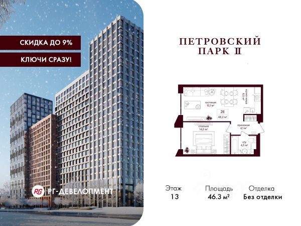 Рассрочка 0%. Первый платёж 30%, второй - не позднее 31.12.2026 г. Продаётся 1-комнатная квартира 46.3 кв.м. в ЖК "Петровский парк II" на 13-м этаже 15 этажного дома. ЖК "Петровский парк II" — жилой комплекс в Савёловском районе, где город ощущается иначе. Здесь история и масштаб Москвы не давят, а задают фон для спокойной, уверенной жизни рядом с центром. Это место, где статус читается не в громких формулировках, а в окружении, архитектуре и ощущении пространства. Коротко о важном: • Район с глубоким историческим контекстом и парковым окружением; • 5 минут пешком до метро "Динамо", рядом с деловой и культурной жизнью города; • Редкое сочетание: энергия мегаполиса и тишина зелёных аллей; • Архитектура от бюро Syntaxis с пластикой форм и индивидуальным характером фасадов; • Панорамные виды на город и зелёные массивы Петровского и Тимирязевского парков; • Закрытый двор без машин, вдохновлённый эстетикой дворцовых садов; • Просторные гранд-лобби с высокими потолками и выверенной, респектабельной эстетикой; • Частный детский сад во дворе; • Подземный паркинг и кладовые; • РГ-Девелопмент - ТОП-20 крупнейших застройщиков Москвы. Расположение комплекса формирует особое ощущение свободы выбора. Утром - прогулка по тенистым аллеям Петровского парка, днём - работа и встречи в деловых кластерах поблизости, вечером - культурные события, рестораны и городские пространства в нескольких минутах пути. Здесь расстояния измеряются не километрами, а шагами от дома. Архитектура "Петровского парка II" задумана как современная доминанта района и одновременно как уважительный диалог с исторической средой. Асимметричные объёмы, волнообразные элементы и игра света и тени создают выразительный, но сдержанный силуэт. Архитектура наполнена воздухом и визуальным ритмом, оставаясь спокойной и уверенной. Общественные пространства продолжают эту логику. Два гранд-лобби с высокими потолками и благородной цветовой палитрой воспринимаются как пространства, где хочется замедлиться: встретить гостей, перевести дыхание после дня или просто почувствовать уровень среды, в которой вы живёте. Внутренний двор комплекса - это отдельный мир, закрытый от машин и городского шума. Ландшафтный дизайн отсылает к регулярным дворцовым садам: геометрия аллей, зелёные "кабинеты", цветники и камерные зоны отдыха создают разные сценарии для повседневной жизни. Здесь органично соседствуют детские игровые пространства, плейхаб, спортивные зоны и тихие места для отдыха. На территории комплекса расположены магазины, кафе и рестораны, а также частный детский сад, встроенный в общую структуру двора. Подземный паркинг и кладовые поддерживают ощущение порядка и цельности пространства.