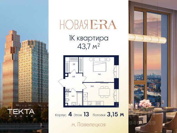 Рассрочка 0% с платежом от 250 000 ₽ в месяц. 1-комн. квартира в ЖК "Era" на 13 этаже в 43 этажном здании Корпус 4. Общая площадь: 43.7 кв.м., жилая: 16.10 кв.м. Высота потолков 3.15 м. Современный премиум-квартал ERA на Дербеневской набережной, формирующий новый архитектурный облик Даниловского района Москвы. Жилой комплекс из шести высотных корпусов выполнен в актуальной интерпретации стиля ар-деко, где ритмичные линии фасадов, натуральный мрамор и изысканные орнаменты создают гармоничный и запоминающийся образ. ERA предлагает жителям единый просторный закрытый двор. Инфраструктура двора включает разнообразные детские игровые площадки, зоны для занятий спортом (воркаут, стритбол, скалодром), а также места для спокойного отдыха — в всесезонном зеленом лабиринте или яблоневом саду. Для озеленения территории планируется высадка около 3000 деревьев и кустарников. Их сохранность обеспечат система автополива, а для комфорта в холодное время года малые архитектурные формы будут оборудованы подогревом. Вторая очередь комплекса включает три корпуса высотой от 37 до 52 этажей. Впечатляющие входные группы, разработанные бюро HAAST, встречают жителей потолками 8,8 метров. В лобби создана атмосфера уюта благодаря индивидуальной ароматизации и музыкальному сопровождению. Здесь же обустроена кофейная зона с профессиональной кофемашиной, а для дополнительного удобства установлен постамат. Высокий стандарт чистоты в любое время года обеспечивают роботы-уборщики, что подчеркивает технологичность комплекса ERA. Для комфортного подъезда такси перед каждым корпусом предусмотрены специальные drop-off зоны. Подземный паркинг на 285 мест. Ключевое преимущество — превосходная локация в развивающемся районе с готовой инфраструктурой. Всего в 5 минутах от Садового кольца, в шаговой доступности от Замоскворечья и набережной Москвы-реки, вы сможете наслаждаться динамикой городской жизни. При этом в самом комплексе на первых этажах будут работать кафе, магазины, салоны красоты и детские образовательные пространства. ERA — это гармоничный симбиоз статусного адреса, безупречного сервиса и приватности для жизни вашей мечты.