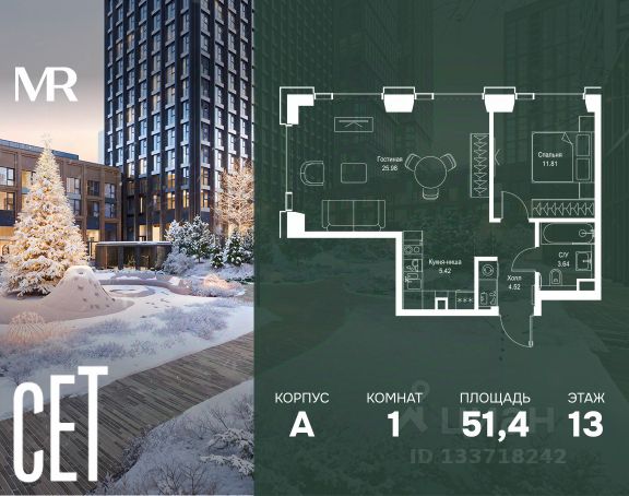 О квартире Продаётся 1-комнатная квартира общей площадью 39.2 кв.м. без отделки. Квартира расположена на 13 этаже корпуса 5.1 в жилом комплексе бизнес-класса "Среда на Лобачевского" в пешей доступности от метро "Аминьевская". О жилом комплексе "Среда на Лобачевского" полностью соответствует критериям современного жилого пространства. Взяв за основу рациональный подход, мы гармонично соединили дизайн, актуальные тренды и функциональность. Продуманный современный экстерьер и функциональные планировки внутри, приватные пространства и разнообразные досуговые зоны для каждого члена семьи — все это "Среда на Лобачевского". Инфраструктура Район отлично развит и наполнен жизнью, здесь уже есть вся необходимая инфраструктура — детские сады, школы, медучреждения, торговые центры, благоустроены парки для прогулок и отдыха, удобен и легкодоступен городской транспорт. Рядом расположены учебные корпуса крупных университетов — МГУ, МГИМО и РАНХиГС. Школы и детские сады в районе занимают высокие позиции в городских рейтингах, поэтому вам не придется беспокоиться о качестве образования детей. Как и об отдыхе: поблизости расположены живописные пруды, реки и парки. Это Парк Олимпийской деревни, Парк имени 50-летия Октября, Мещерский парк и Очаковские пруды. Теперь поставить галочки в еженедельном чек-листе "спорт-прогулки-встречи с друзьями" можно, не покидая любимый район. Особенности Особое внимание в проекте уделяется созданию функциональных пространств не только внутри дома, но и за его пределами. В ландшафтном парке "Среды на Лобачевского" расположены крытые зоны для спокойного времяпровождения, места для активного отдыха и спорта, коворкинг, соседский комьюнити-центр, водные объекты. —Ландшафтный парк во дворе. —Водный сад с зонами отдыха. —Зоны коворкинга. —Дизайнерские гранд-лобби. —Бесключевой доступ. —Подземный паркинг.