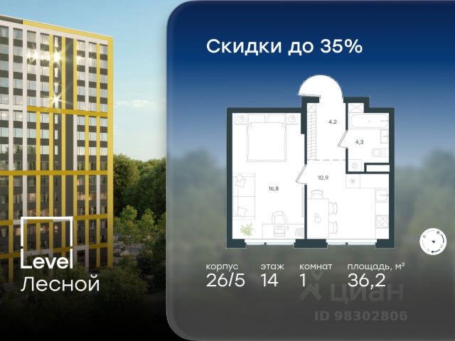 В районе, утопающем в густой зелени лесов, многочисленных парков и скверов, продаётся 1-комнатная квартира площадью 38.00 кв.м без отделки. Квартира расположена на 14 этаже в жилом комплексе комфорт-класса Level Лесной (компания Level Group/Левел групп).