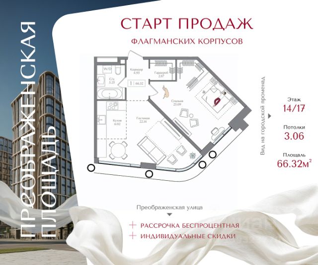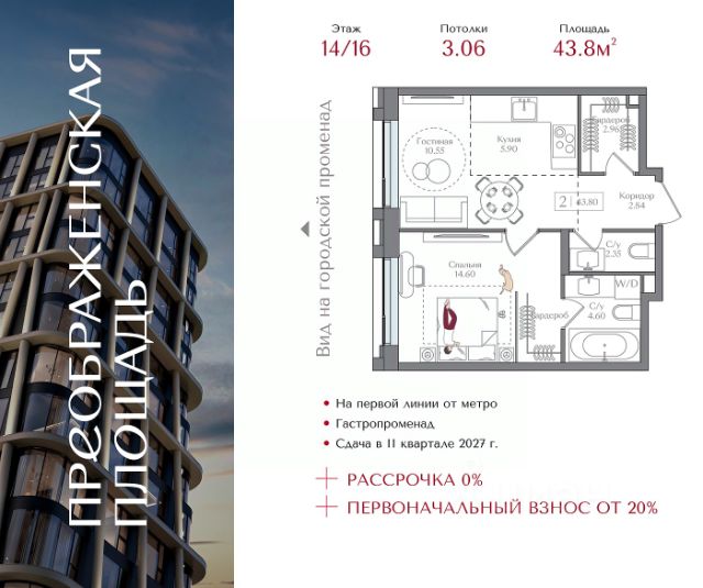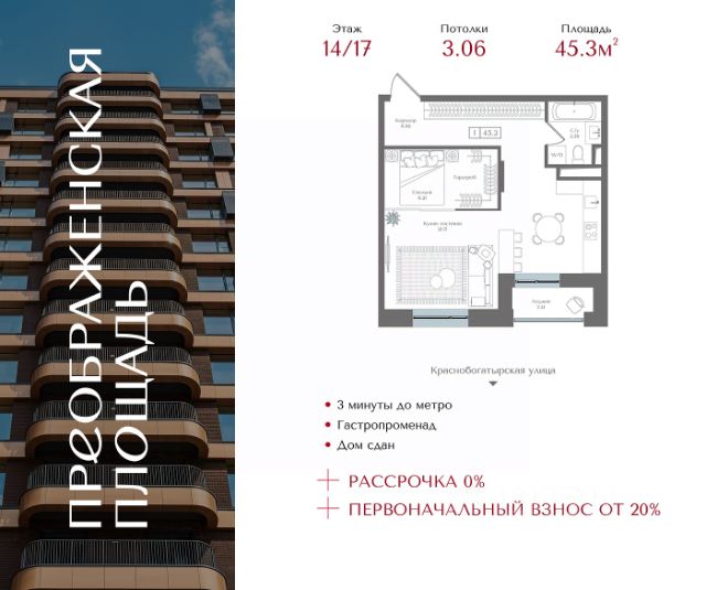 Рассрочка 0% с первоначальным взносом от 20% Квартира на 14 этаже в жилом комплексе премиум-класса "Преображенская площадь". Общая площадь: 40.9 кв.м. Проект премиум-класса в историческом районе Москвы. До метро "Преображенская площадь" 3 минуты пешком. Квартиры сдаются без отделки и в свободной планировке, чтобы жители могли оформить пространство с учетом своей индивидуальности. Высота потолков от 3,15м, широкоформатное остекление, 3-5 квартир на этаже. Система Умный дом. Дизайнерские лобби. Внутренний двор 1,5 га функциональное и безопасное пространство для игр, работы и занятий спортом. Пешеходный променад для прогулок. Дома переменной этажности. Есть подземный паркинг. Жилой комлекс находится в окружении парков Сокольники, Черкизовский, Измайловский, заповедника Лосиный остров и ВДНХ, а также вблизи пешеходной набережной. Комфортная удаленность от центра: 7 минут на автомобиле до ТТК, 8 минут до Садового кольца, 25 минут до Кремля.