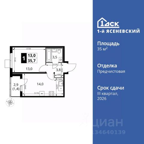 Прямая продажа от застройщика! Жилой Комплекс класса Комфорт Плюс. Продаётся 1-к квартира номер 553 общей площадью 34.7 кв.м. на 14-м этаже 18 этажного здания. Отделка Whitebox. Особенности квартиры: - Квартиры рядом с метро - м. Корниловская 9 мин пешком - 63 га лесопарка за окнами - Школа c it-кластером и бассейном. 2 детских сада - Мастер-зона с гардеробной. Просторное место для отдыха и удобного хранения вещей. - Линейная планировка - максимальная функциональность и удобство. - Гардеробная - удобство для хранения и организации вещей. - Ниша под шкаф - компактное и удобное место для вещей. - Лоджия - уютное место для отдыха и тишины. Квартира с предчистовой отделкой (White box). Вам не придется заниматься черновыми и трудоёмкими работы, а чистовую отделку и дизайн - сделайте на свой вкус. Информация о комплексе: В жилом комплексе комфорт-плюс класса "1-го Ясеневского" доступны преимущества двух стилей жизни. Ведь в пешей доступности метро, школа с 25-метровым бассейном и IT-кластером и при этом целых 63 га благоустроенного Троицкого лесопарка под окнами, где так приятно дышать свежим воздухом и слушать пение птиц. Собственная закрытая территория "1-го Ясеневского" представляет собой уютный оазис. Здесь и зеленый освещенный бульвар для прогулок, система велодорожек, маленькая городская площадь, кафе, пекарни и кофе поинты. А еще дворы без машин и многоэтажная парковка. Изюминка территории - фруктовые деревья во дворах и городские сады. "1-й Ясеневский" - всего в 1 км от МКАД, на территории новой Москвы. Жилой комплекс, где есть все необходимое для современного человека. Транспортная доступность: До метро "Корниловская" - 12 минут пешком До метро "Тютчевская" - 25 минут пешком До метро "Теплый стан" - 10 минут на транспорте До метро "Ольховая" - 30 минут на общественном транспорте Личный автотранспорт: Выезд на Калужское шоссе - 500 м МКАД - 1 км Внутренняя инфраструктура: ЖК "1-й Ясеневский" можно назвать идеальным местом для жизни семьи с детьми. Здесь буквально за домом находится Троицкий лесопарк - излюбленное место прогулок молодых родителей. А во внутренних дворах под детские площадки выделены специальные зоны. Они оборудованы всем, что нужно для счастливого детства: современными и максимально безопасными качелями, песочницами и лазалками. Оборудование и игровые сценарии на детских площадках спроектированы вместе с командой детских психологов для правильного развития ребенка и для повышения их интереса. Также рядом с домом два детских садика, один из которых уже построен и школа на 1100 мест. Школу по праву можно назвать образцовым учебным заведением. В ней закладываются основы успешного будущего. Здесь есть класс робототехники, IT-кластер, 25-метровый бассейн и прекрасно оборудованные спортзалы.