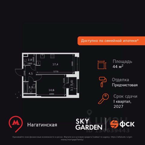 Продаётся 1-к квартира номер 433 общей площадью 44.2 кв.м. на 14-м этаже 26 этажного здания. Отделка Whitebox. Цена с учётом скидки.
