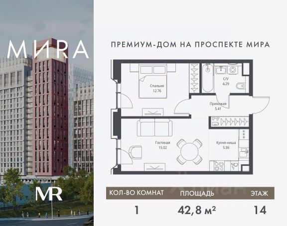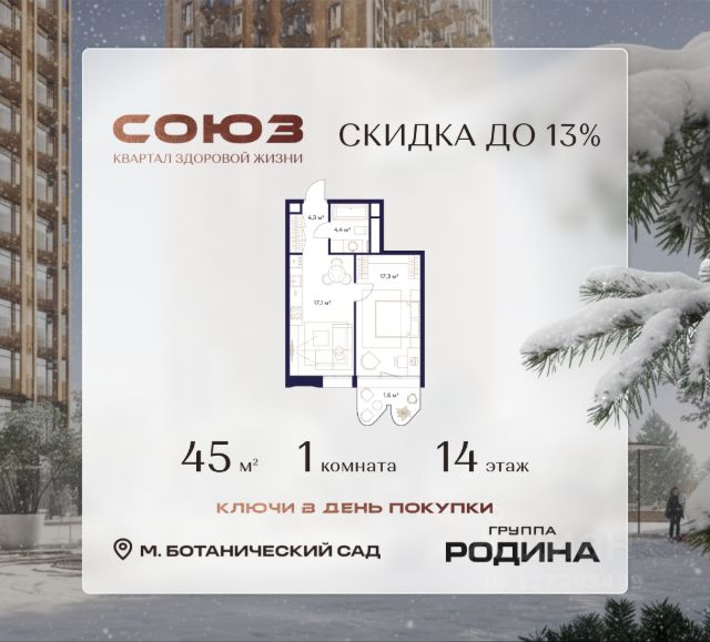 Рассрочка 0% Продаётся 1-комнатная квартира площадью 41.8 м² на 14 этаже в Жилом Комплексе "Союз". Квартал здоровой жизни премиум-класса с рекордным количеством олимпийских видов спорта: - Ледовая арена для хоккея и фигурного катания, - Футбольные поля для тренировок, - Спортивный зал для фехтования, - Бассейн на 6 дорожек, - Центр единоборств, - 4 крытых площадки для настольного тенниса, - 7 теннисных кортов (крытых и открытых), - 4 крытых площадки для сквоша, - Легкоатлетический стадион, - Площадки для баскетбола и волейбола. Уникальные форматы квартир с мастер-спальнями, приватными террасами, балконами, а также пентхаусы с открыточными видами на город. Все квартиры продаются с отделкой Shell&Core и панорамным остеклением. Расположение Пешком: - 2 мин. до парка "Сад Будущего"; - 6 мин. до ст. м. "Ботанический сад"; - 6 мин. до ст. МЦК "Ботанический сад"; - 6 мин. до парка "Леоновская роща"; На автомобиле: - 2 мин. до СВХ (МСД); - 5 мин. до Проспекта Мира; - 10 мин. до ТТК; - 15 мин. до Садового кольца; - 25 мин. до аэропорта "Шереметьево". Благоустройство - собственная спортивная инфраструктура 7 Га; - зона для пикников; - игровые и спортивные площадки для детей всех возрастов; - розарий, а также сосновые, каштановые и дубовые аллеи; - площадки под открытым небом для занятий спортом и йоги; - игровые комнаты для детей; - лаунж-зона для резидентов; - просторная переговорная для деловых встреч; - премиальный ресторан "Шабада" Сосо Павлиашвили с водными арт-объектами на прогулочной аллее, садом ароматных трав и сценой под открытым небом; - кафе, химчистки, аптеки и супермаркеты рядом с домом. Окружение - 8 парков: Сад Будущего, Леоновская роща, Хуамин, Главный ботанический сад РАН, Шереметьевская дубрава, Останкино, парк спорта "Яуза", пойма реки Яуза и музей-усадьба "Останкино"; - 3 ВУЗа: ВГИК, РГСУ, МГПУ; - 12 школ, в том числе: школа 1499 им. И.А. Докукина (топ 100), Brookes Moscow, IThub школа; - 18 детских садов, в том числе билингвальный ALERTUM KIDS; - один из крупнейших океанариумов Европы "Москвариум"; - один из крупнейших в Европе торгово-развлекательных центров "Европолис".