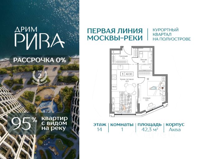 СТАРТ ПРОДАЖ ВИДОВЫХ КВАРТИР Квартира со 100% видом на Москву-реку в премиальном квартале Дрим Рива — первая линия Москвы-реки. На территории курортной локации "Остров мечты". 42.3 кв.м, 1 комната, 14 этаж. Высота потолков 3,1 м. • 95% квартир смотрят на воду • Мастер-спальня с гардеробной • Естественный свет в гостиной с двух сторон ЛОКАЦИЯ И ТРАНСПОРТ • 15 минут на авто до Садового кольца, • 30 минут до Москва-Сити и Кремля. • 10 минут до метро "Технопарк" в пешей доступности. В перспективе — станция "Остров мечты" (2028г.). ИНФРАСТРУКТУРА КВАРТАЛА • 3 Га приватного двор-парка с зонами для спорта, йоги и отдыха; • Благоустроенная набережная с гастропроменадом; • Клубные лобби с инфраструктурой; • Премиум SPA-центр с бассейном и фитнес-клуб; • Государственный детский сад под окном и школа в 10 минутах от квартала; • Подземный и гостевой паркинг. ИНФРАСТРУКТУРА ДЛЯ СЕМЕЙ — государственные детский сад и школа на территории. 44 гектара парков вокруг создают условия для прогулок, спорта и детск ого досуга. ПРИВИЛЕГИИ РЕЗИДЕНТОВ • Пляжный клуб Dream Beach Club; • Яхт-клуб Dream Yacht Club; • Вейк-клуб; • Парк развлечений "Остров мечты"; • 44 Га парков для прогулок и спорта в окружении квартала. БЕЗОПАСНОСТЬ И КОМФОРТ • Приватная территория; • Охрана; • Видеонаблюдение; • Консьерж-сервис 24/7; • Современные инженерные системы и технологии умного дома. НАДЕЖНЫЙ ЗАСТРОЙЩИК Regions Development — успешная девелоперская компания. За 20 лет работы реализовали уже более 30 проектов в сегментах коммерческой и многофункциональной недвижимости. Скидки действуют только при 100% оплате и ипотеке Скидки действуют только при 100% оплате, ипотеке и рассрочке. Скидки и акции не суммируются. Звоните, чтобы договориться о просмотре!