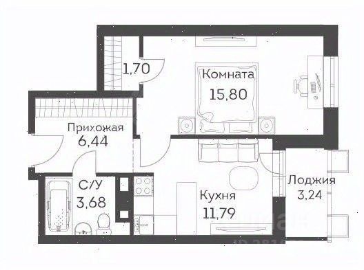 Общая площадь 38,5 м2., жилая 18 м2., кухня 8,7 м2, потолки 2,8 метра.