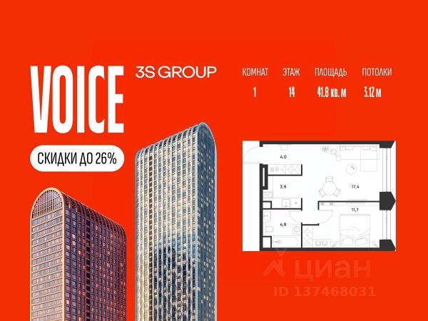 Ипотека от 3,5% на весь срок. Дополнительная скидка в офисе продаж! Продается уютная 1-комн. квартира площадью 44,5 кв.м на 14 этаже жилого комплекса бизнес-класса Voice Towers от 3S Group. Общая площадь: 44,5 кв.м., жилая: 30,7 кв.м., площадь кухни-гостиной: 24,6 кв.м., высокие потолки: 3,12 м., санузел совмещенный. О проекте: Voice. Высокие стандарты жизни Мы уверены, что высокие идеалы неизменно помогают достигать высот. Создавая Voice, мы ориентировались на людей с высокими требованиями к качеству и безупречным вкусом. Башни жилого комплекса, сочетают элегантную форму с динамичной геометрией фасадов, устремляются ввысь и отвечают самым высоким стандартам строительства. Технологичность, воплощенная в архитектуре - это ваш, собственный Voice. Преимущества локации Близость к метро Текстильщики, БКЛ и МЦК Новохохловская (10 мин) Рядом природный заповедник и конно-спортивная база Кузьминки-Люблино Будущее окружение Проект Южный порт - Текстильщики с деловым центром Сити-2 Небоскребы высотой до 300м Культурный центр с амфитеатром Променад вдоль Москвы-реки и яхт-клуб Архитектура Проект от Архитектурной мастерской Алексея Ильина Две перпендикулярные башни с арочными вершинами Высокая башня: светло-серый металл Низкая башня: терракотовая керамика Благоустройство Внешняя зона: парковки, магазины, кафе Внутренний двор: закрытая территория с озеленением Шумозащитный экран Сезонное озеленение Встречи на высоте Гранд-лобби высотой 8м Дизайнерская мебель Умные скоростные лифты Услуги Детский центр с игровой зоной Фитнес-студия для жителей