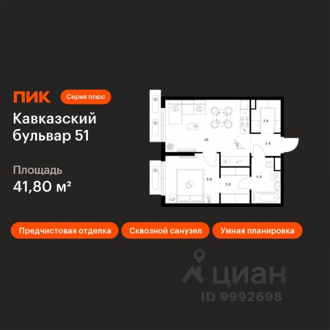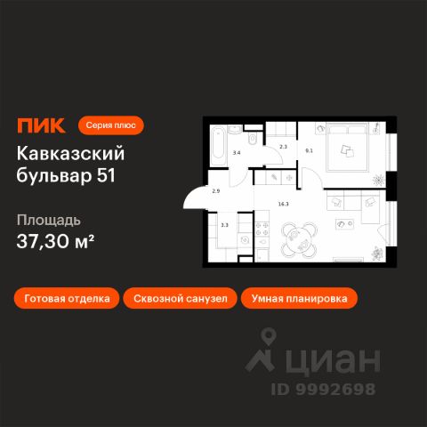 Продаётся 1-комн. квартира площадью 34,3 кв.м на 15 этаже 32 этажного дома (Корпус 3.6, Секция 3) проекта ПИК Кавказский бульвар 51. Светлый просторный подъезд на уровне земли, функциональная планировка, большие окна, c отделкой. "Кавказский бульвар 51" — современный жилой квартал в районе Царицыно. Проект частично реализован и находится в районе Царицыно, недалеко от одноимённого музея-заповедника. До метро "Кантемировская" — 17 минут пешком. За 20 можно дойти до станции "Чертаново". В 10 минутах на машине — МКАД, в 11 минутах — Варшавское шоссе, а в 16 минутах — ТТК. В проекте жилые дома высотой от 5 до 33 этажей, детский сад и школа. На первых этажах доступны магазины, кафе, салоны красоты и другие сервисы — чтобы купить кофе и свежий хлеб к завтраку, можно просто спуститься на лифте. В уютных дворах-парках есть места для отдыха и детские площадки. Для прогулок на свежем воздухе мы построим для жителей широкий пешеходный бульвар. В районе вокруг "Кавказского бульвара 51" есть всё для комфортной жизни: детские сады, школы, поликлиники, магазины и торговые центры. Девять минут на машине — и вы у музея-заповедника "Царицыно", где можно гулять среди исторических построек, лежать на траве под тенью деревьев или заниматься спортом на специальных площадках. Есть парки и поближе: до Аршиновского можно дойти за 8 минут, а до парка "Сосенки" — за 13 минут. Артикул 998944 (Застройщик АО "СПЕЦИАЛИЗИРОВАННЫЙ ЗАСТРОЙЩИК "ТОРГОВЫЙ ДОМ СПУТНИК")