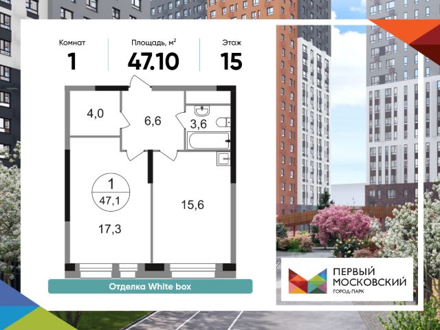 Продается однокомнатная квартира без отделки в 9 фазе города-парка "Первый Московский". Общая площадь квартиры - 35,5 кв. м, этаж 15 из 19. Срок сдачи - 2 квартал 2026 года. Тип дома - монолитный. Город-парк "Первый Московский" расположен всего в 7 км по Киевскому шоссе от МКАД на территории Новой Москвы. Из города-парка прямой выезд на Киевское шоссе и трассу Солнцево-Бутово-Варшавское шоссе. ТРАНСПОРТНАЯ ДОСТУПНОСТЬ: - 5 мин. на личном автомобиле или 10 мин. на автобусе 189 и 876 до станции метро "Филатов Луг" - 20 мин. пешком до станции метро "Филатов Луг" ИНФРАСТРУКТУРА И БЛАГОУСТРОЙСТВО: 9 фаза сочетает в себе максимальную близость данной фазы строительства к парку Филатов луг. Основной акцент в благоустройстве сделан на разнообразные детские площадки и развивающие комплексы, с зонами для активного и спокойного отдыха взрослых. В доме предусмотрен подвальный этаж для кладовых помещений. В корпусе предусмотрено 2 коммерческих помещения свободного назначения на 1 этаже. АВТОРСКИЙ ДИЗАЙН: Входные группы выполнены по авторскому дизайну, оснащены системой "тёплый пол". В каждой входной группе будет располагаться комфортабельная зона ожидания. При входе предусмотрено помещение для хранения колясок и на -1 этаже располагается велопарковка.