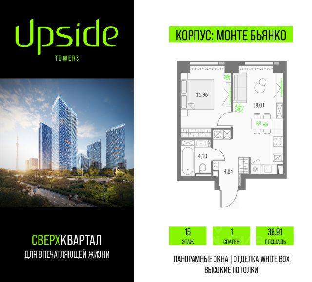 Продаётся 1-комнатная квартира площадью 41.91 кв.м на 15 этаже 19 этажного корпуса Олимп в квартале небоскребов "Upside Towers". В квартире отделка White-box, c видом на внутренний двор, ландшафтный парк. Номер квартиры В1509. Upside Towers - технологичный квартал строится в динамично развивающемся Бутырском районе, в 3 мин. от метро, в 5 мин. от ТТК. На территории 7 га возводится 5 высотных башен от 19 до 58 этажей, названных в честь главных вершин земли. Квартиры с панорамными окнами в пол, высокими потолками и современными инженерными решениями. Благоустроенная зеленая территория включает: приватные дворы, природный комплекс, прогулочный бульвар, ландшафтный парк 2,5 га с сенсорным садом и многофункциональными игровыми и спортивными площадками. В корпусе откроются магазины, кафе и рестораны, а также другие объекты коммерческой инфраструктуры. Большое внимание в проекте уделяется созданию социальной инфраструктуры. Между "Атласом" и "Олимпом" в трехэтажном стилобате разместится уникальное пространство закрытый клуб для жителей квартала Upside Club площадью 2 000 кв. м. Здесь разместятся: каминный зал с роялем, многофункциональная детская зона c двухуровневым игровым оборудованием для малышей и дошкольников, плей-рум для подростков, домашний кинотеатр, коворкинг, переговорные и лектории. На 47 этаже башни "Атлас" откроется SKY SPA Relax с расслабляющей атмосферой, джакузи, сауной, залами для релаксации и йоги. Собственники квартир смогут в любое удобное для них время забронировать посещение спа-зоны через смарт-приложение. На крыше стилобата разместится всесезонная BBQ патио-зона с верандой и закрытыми помещениями для приготовления и отдыха. В башнях откроются смотровые террасы для резидентов с панорамными видами на город, парки, Останкинскую башню, ВДНХ, Ботанический сад и Москву-Сити. Покупая квартиру даже самого минимального размера в Upside Towers, вы получаете в пользование 2 000 м² бесплатных общественных пространств. В рамках проекта строится государственная школа и детский сад, разместится более 15 000 кв.м. коммерческой инфраструктуры. Насыщенная социальная инфраструктура формирует множество сценариев для жизни на территории квартала. В Upside Towers применяются лучшие технологии и практики, чтобы обеспечить высшее качество жизни: Воздух, не уступающий по качеству горному, обеспечит приточно-вытяжная вентиляция. Пятиступенчатая очистка воды с сохранением полезных минералов. Центральное кондиционирование. Внутрипольные конвекторы с естественной конвекцией. Современные системы безопасности и мониторинга микроклимата. Высокоскоростной интернет на всей территории, в квартирах и паркинге за счет усиления GSM-связи всех ведущих операторов. Все места в подземном паркинге оборудованы зарядками для электрокаров. Бутырский район непрерывно развивается и готовится стать новым современным деловым районом Москвы. В рамках программы "Индустриальные кварталы" комплексного развития территории Огородного проезда будут построены современны