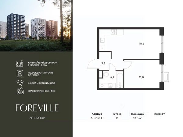 Пешая доступность от метро и московская прописка! Продается уютная 1-комн. квартира площадью 37,6 кв.м на 15 этаже 17 этажного жилого комплекса бизнес-класса Foreville от 3S Group. Общая площадь: 37,6 кв.м., жилая: 23 кв.м., площадь кухни-гостиной: 18,6 кв.м., высота потолков: 3 м., окна выходят на улицу. Квартира предлагается без отделки, что идеально подходит для воплощения собственного дизайнерского решения. Также доступна опция предчистовой отделки, стоимость которой включается в общую цену квартиры. О проекте: Пространство Комплекс располагает крупнейшим приватным двор-парком в Новой Москве площадью 1,2 Га, предлагая жителям огромное пространство для отдыха, спорта и игр на свежем воздухе. Природный ландшафт Внутренний лесопарк с более чем 183 взрослыми деревьями и 10 320 цветущими кустарниками создает уникальную природную атмосферу для каждого времени года. Игровые и спортивные зоны Обширные площадки с безопасным покрытием, специализированные зоны для детей разных возрастных групп и взрослых, включая воркаут и настольный теннис, способствуют активному и здоровому образу жизни. Экологичность и долговечность Использование натуральных материалов, таких как лиственница, и крупноформатной бетонной плитки для покрытия, подчеркивает стремление проекта к экологичности и устойчивости. Безопасность и уединение Внутренний двор без машин обеспечивает безопасность для детей и спокойствие для взрослых. Территория огорожена и находится под круглосуточным видеонаблюдением. Сохранение времени Благодаря превосходной транспортной доступности и близости к новой станции метро Корниловская, Foreville позволяет жителям экономить время для семьи и отдыха на природе, минимизируя необходимость длительных поездок. Foreville не просто жилье, а целая экосистема для комфортной и гармоничной жизни на свежем воздухе, совмещая преимущества городской инфраструктуры и непосредственную близость к природе.