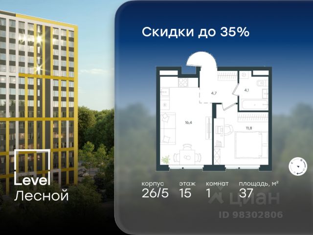 Цена указана с учётом скидки при 100%-й оплате, несубсидированной ипотеке, рассрочке (кроме программы "Рассрочка 0%"). В районе, утопающем в густой зелени лесов, многочисленных парков и скверов, продаётся 1-комнатная квартира площадью 33.70 кв.м без отделки. Квартира расположена на 15 этаже в жилом комплексе комфорт-класса Level Лесной (компания Level Group/Левел групп). Отличная транспортная доступность: - 25 мин. пешком до станции метро "Пятницкое шоссе"; - 28 мин. на автобусе до станции метро и МЦД-2 "Волоколамская"; - 11 мин. на авто до МКАД; - 25 мин. на авто до ТТК. Продуманный архитектурный проект: - Концепция проекта Level Лесной от бюро СПИЧ; - Высотность комплекса до 15 этажей с уникальными видами на лесные массивы и город; - Высота потолков до 3 м; - Современные окна высотой до 1,6 м, в части квартир предусмотрены окна в пол. Высота подоконников 0,6 м; Расположение: Level Лесной строится в зелёной зоне ближайшего Подмосковья, г.о. Красногорск в посёлке Отрадное. Шаговая и автомобильная доступность до метро и больших транспортных артерий города. За 25 минут вы дойдёте до станции метро "Пятницкое шоссе", а за 20 минут на машине сможете доехать до станции метро "Тушинская". Район окружен роскошной зеленью лесов и парковых зон, занимающих территорию свыше 1 000 гектаров. Помимо благоприятной экологии, здесь множество возможностей для активного отдыха и поддержания физической формы. Облагороженная территории с полностью развитой инфраструктурой. На территории проекта находится детский сад и школа "Светлые Горы", которая входит в список лучших частных школ от Forbes Education (по данным на 2023г.). Кроме того, в пешей доступности расположено ещё 8 детских садов, а также запланировано открытие современной муниципальной школы. В непосредственной близости находятся сетевые супермаркеты и локальные магазины, аптеки, клиники, почта, библиотека, салоны красоты, рестораны, спортивные и творческие секции, развивающие детские центры. В 12 минутах пешком расположен торговый парк "Отрада" с продуктовым и строительным гипермаркетами, магазинами, кинотеатром и развлечениями для детей. Внутренняя инфраструктура: Мы знаем, как важно, чтобы магазины и сервисы были всегда рядом. В сданных корпусах Level Лесной уже расположена полностью готовая развитая инфраструктура. На первых этажах корпуса 27 предусмотрено ещё 14 коммерческих помещений. Благоустройство: Продуманное пространство и аура приватного европейского городка рождают чувство лёгкости и расслабления у каждого, кто попадает на территорию проекта. Концепцию общественных площадок разработали в партнёрстве два архитектурных бюро: Highlight Architecture и SCAPE. В безопасных дворах без машин каждый обязательно найдёт себе место для вдохновения, отдыха и спорта.