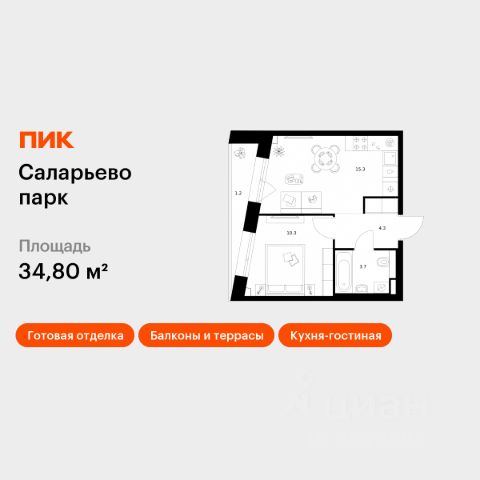 Продаётся 1-комн. квартира площадью 31,9 кв.м на 15 этаже 15 этажного дома (Корпус 57.2, Секция 2) проекта ПИК Саларьево парк. Светлый просторный подъезд на уровне земли, функциональная планировка, большие окна, предчистовая отделка. Жилой район "Саларьево парк" расположен в Новой Москве, в четырёх километрах от МКАД по Киевскому шоссе. Две станции метро: "Саларьево" и "Филатов луг", — находятся в пешей доступности от проекта. Дойти до них можно за 510 минут. В квартале уже создана качественная среда, где есть абсолютно всё для полноценной жизни, работы и отдыха. Благодаря удобному расположению проекта всё важное будет рядом: детские сады, школы, кафе и рестораны, шопинг в торговых центрах, фитнес и даже аэропорт. Все корпуса в квартале гармонично сочетаются, образуя единую городскую среду. Между собой их объединяет невысокая этажность и натуральная цветовая гамма. Здесь приятно гулять и проводить время на улице всей семьёй. В "Саларьево парке" создана уникальная образовательная среда, включающая в себя шесть школ, рассчитанных на 6 250 учеников. Две из них уже открыты, их посещает 2 300 детей. Также на территории "Саларьево парка" находится 12 детских садов, один из которых с бассейном. Сейчас уже открыты 7 садов. В "Саларьево парке" открыта уникальная игровая площадка — PlayHub "Оригами". Здесь есть ручей, горка-труба и рельефные холмы. Взрослые смогут отдохнуть в уютном кафе, пока дети играют. Также на территории проекта есть SportHub — большая спортивная зона, разделённая по интересам и возрастам. Здесь можно заниматься разными видами спорта: футболом, баскетболом, волейболом и стритболом. Зимой центральную часть площадки превращают в каток. Во дворах-парках жилого квартала есть места для отдыха, детские и спортивные площадки. На первых этажах домов расположены магазины, кафе и полезные сервисы. Также вблизи проекта есть несколько масштабных торговых центров. До ТЦ "Саларис" пять минут пешком, до "Рио", Metro Cash & Carry и "Леруа Мерлен" — пять минут на автомобиле. Артикул 1019190 (Застройщик ООО "Специализированный Застройщик "Тирон")