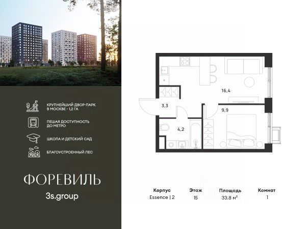 В жилом комплексе, расположенном по соседству с ландшафтным парком "Южное Бутово", продается 1-комнатная квартира площадью 47.40 кв. м. с отделкой. Квартира расположена на 15 этаже 2 корпуса в жилом квартале комфорт-класса "Новые Смыслы" (ГК Unikey/Юникей). Доступная и удобная локация: - 10 минут ходьбы до станции метро "Потапово". - 25 минут ходьбы до станции метро "Бунинская аллея". - 15 минут на авто до Калужского шоссе. - 20 минут на авто до МКАД. - 30 минут на машине до аэропортов "Внуково" и "Остафьево". Продуманный архитектурный проект: - Разноуровневые секции с эстетичные башнями и контрастными цветовыми сочетаниями, напоминающими башни в Сити. - Сказочные виды из окон на современный район столицы. - Авторские планировки с потолками в 3 метра, просторными кухнями-гостиными и мастер-спальнями. - Комфортные бесплатные общественные пространства. - Подземный паркинг с прямым доступом на лифте. - Настоящий лес с живописными пейзажами и прудом прямо во дворе. Расположение Комплекс "Новые Смыслы" расположится в благоприятном районе Новой Москвы - Коммунарка. Зеленое окружение, богатая инфраструктура развивающегося района - все это сформирует особое пространство для комфортной жизни, наполненной смыслом. 10 минут на велосипеде - и вы в ландшафтном парке "Южное Бутово" или сквере у Потаповских прудов. Чуть дальше расположен Бутовский лесопарк. В окружении "Новых Смыслов" вы найдете все необходимые социальные объекты. В двух шагах от дома находится 5 школ, более десятка детских садов, секции для занятий малышей и подростков, частные клиники, супермаркеты, рестораны, студии красоты и фитнес-центры. За 12 минут на авто вы доберетесь до ледовой арены, комплекса "Спорт Станция" и спа-центра "Termoland". Внутренняя инфраструктура Для жителей "Новых Смыслов" будут созданы бесплатные общественные пространства: - Деловая гостиная с эстетичным коворкингом и переговорными. - Гостиная для души и тела, включающая фитнес-зону с тренажерами и пространства для стретчинга, йоги и медитаций. - Гостиная детства, где дети будут играть и развиваться под присмотром тьютора. - Кино-гостиная - кинотеатр на крыше одного из домов, предлагающий разнообразную программу. - Прачечная, работающая только для жильцов. Вместе с корпусами комплекса на территории запланировано строительство детского сада. На первых этажах корпусов откроются кофейни, пекарни, сервисы быта и пункты доставки. Благоустройство Чтобы отдохнуть от суеты города, достаточно выйти во двор: здесь раскинулся настоящий лес с живописными пейзажами. В тени деревьев жителей ждут пруд с мостиком и беседкой на берегу, тихие прогулочные аллеи, спортивная площадка и зоны для занятий йогой и бадминтоном на свежем воздухе. Юных жителей порадуют современные детские площадки, жукарий и специальное пространство для подвижных игр. Безопасность на территории гарантирована: двор огорожен от машин и оснащен камерами видеонаблюдения.