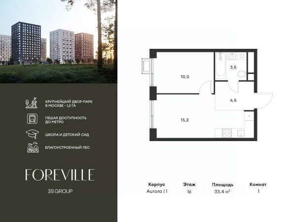 Пешая доступность от метро и московская прописка! Продается уютная 1-комн. квартира площадью 33,4 кв.м на 16 этаже 17 этажного жилого комплекса бизнес-класса Foreville от 3S Group. Общая площадь: 33,4 кв.м., жилая: 20,8 кв.м., площадь кухни-гостиной: 15,2 кв.м., высота потолков: 3 м., окна выходят на улицу. Квартира предлагается без отделки, что идеально подходит для воплощения собственного дизайнерского решения. Также доступна опция предчистовой отделки, стоимость которой включается в общую цену квартиры. О проекте: Пространство Комплекс располагает крупнейшим приватным двор-парком в Новой Москве площадью 1,2 Га, предлагая жителям огромное пространство для отдыха, спорта и игр на свежем воздухе. Природный ландшафт Внутренний лесопарк с более чем 183 взрослыми деревьями и 10 320 цветущими кустарниками создает уникальную природную атмосферу для каждого времени года. Игровые и спортивные зоны Обширные площадки с безопасным покрытием, специализированные зоны для детей разных возрастных групп и взрослых, включая воркаут и настольный теннис, способствуют активному и здоровому образу жизни. Экологичность и долговечность Использование натуральных материалов, таких как лиственница, и крупноформатной бетонной плитки для покрытия, подчеркивает стремление проекта к экологичности и устойчивости. Безопасность и уединение Внутренний двор без машин обеспечивает безопасность для детей и спокойствие для взрослых. Территория огорожена и находится под круглосуточным видеонаблюдением. Сохранение времени Благодаря превосходной транспортной доступности и близости к новой станции метро Корниловская, Foreville позволяет жителям экономить время для семьи и отдыха на природе, минимизируя необходимость длительных поездок. Foreville не просто жилье, а целая экосистема для комфортной и гармоничной жизни на свежем воздухе, совмещая преимущества городской инфраструктуры и непосредственную близость к природе.