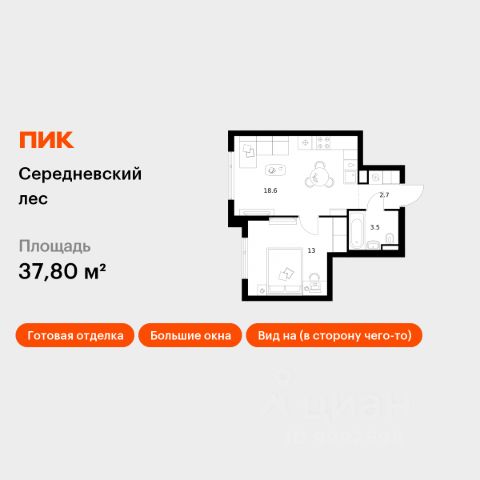 — функциональная планировка: большая кухня-гостиная 13.4 кв.м., просторная комната 12,7 кв.м., вместительная прихожая с нишей для шкафа, совмещенный сан.узел 4.1 кв.м.