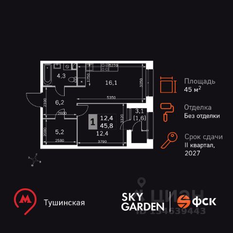 Продаётся 1-к квартира номер 114 общей площадью 45.8 кв.м. на 16-м этаже 29 этажного дома. Без отделки. Цена с учётом скидки!