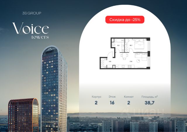 Ипотека от 3,5% на весь срок.Предчистовая отделка в подарок Дополнительная скидка в офисе продаж! Продается уютная студия площадью 29,9 кв.м на 16 этаже жилого комплекса бизнес-класса Voice Towers от 3S Group. Общая площадь: 29,9 кв.м., жилая: 17,2 кв.м., площадь кухни-гостиной: 22,7 кв.м., высокие потолки: 3,12 м., санузел совмещенный. О проекте: Voice. Высокие стандарты жизни Мы уверены, что высокие идеалы неизменно помогают достигать высот. Создавая Voice, мы ориентировались на людей с высокими требованиями к качеству и безупречным вкусом. Башни жилого комплекса, сочетают элегантную форму с динамичной геометрией фасадов, устремляются ввысь и отвечают самым высоким стандартам строительства. Технологичность, воплощенная в архитектуре - это ваш, собственный Voice. Преимущества локации Близость к метро Текстильщики, БКЛ и МЦК Новохохловская (10 мин) Рядом природный заповедник и конно-спортивная база Кузьминки-Люблино Будущее окружение Проект Южный порт - Текстильщики с деловым центром Сити-2 Небоскребы высотой до 300м Культурный центр с амфитеатром Променад вдоль Москвы-реки и яхт-клуб Архитектура Проект от Архитектурной мастерской Алексея Ильина Две перпендикулярные башни с арочными вершинами Высокая башня: светло-серый металл Низкая башня: терракотовая керамика Благоустройство Внешняя зона: парковки, магазины, кафе Внутренний двор: закрытая территория с озеленением Шумозащитный экран Сезонное озеленение Встречи на высоте Гранд-лобби высотой 8м Дизайнерская мебель Умные скоростные лифты Услуги Детский центр с игровой зоной Фитнес-студия для жителей