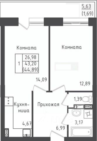 Продаётся 1-комнатная квартира в строящемся доме (Дом 1), срок сдачи: I-кв. 2026, общей площадью 44.89 кв.м., на 2 этаже. Квартал жилой застройки "Зеленый Оазис-Город"