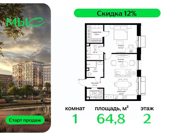 Прямая продажа от застройщика. Продаётся 1-комнатная квартира общей площадью 44.25 м² без отделки в премиальном жилом комплексе "МЫС" на 2-м этаже 12 этажного дома. Квартира расположена в корпусе "Волга". Проект МЫС — это, прежде всего, идеальное место для семей. В рамках проекта построят государственную школу, два детских сада и дворец спорта площадью 20 000 м2 с термальным комплексом, выплывным бассейном, фитнес-залом, теннисными, сквош и падел кортами и секциями для детей. На территории площадью, сравнимой с тремя парками Зарядье, появятся кафе и рестораны, пруд с набережной, спортивные и детские площадки, скейт-парк, лыжные и веломаршруты. Расположение: - 2 минуты до скоростной трассы М1 и Минского шоссе; - 10 минут до МКАД; - 15 минут до МЦД Лесной Городок - 20 минут до делового центра "Москва-Сити"; - 28 минут до аэропорта "Внуково". Благоустройство: - велосипедные и лыжные маршруты; - собственная набережная и парк; - лаунж-зоны в окружении природы; - беседки у очага; - дворец спорта площадью 20 000 м²; - термальный комплекс с тремя бассейнами; - 4 теннисных и падел-корта; - 6 сквош-кортов; - многофункциональный спортзал; - скейт-парк; - просторная площадь для прогулок с фонтаном; - детский Клуб с творческими секциями; - гастро-доминанта; - кафе у пруда, рестораны, ритейл. Окружение - соседство с лесным фондом; - школа на 1250 мест и 2 детских сада на 350 и 255 мест; - Дубковский и Подушкинский леса, парк "Рассказовка", Мещерский парк. Действуют специальные условия при 100% оплате, подробности уточняйте у менеджера в офисе продаж.