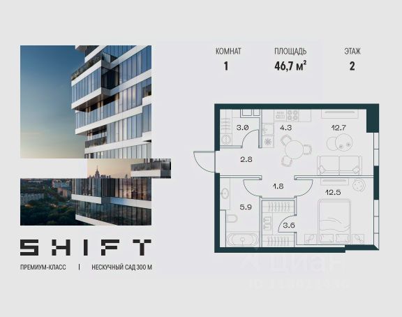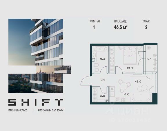 1-к квартира в премиальном комплексе SHIFT на 2-м этаже в 18 этажном здании. Общая площадь 46.5 кв. м. SHIFT - новый премиальный проект от девелопера PIONEER в Донском районе, в 300 м от Нескучного сада. Главная особенность проекта - 5 башен, в которых воплощен принцип модульной архитектуры: каждый этаж смещен относительно предыдущего, что создает эффект парящих в воздухе граней. Архитектура SHIFT создана самым востребованным бюро Москвы - "Цимайло Ляшенко и Партнеры". У жилого квартала удобное расположение: Ленинский проспект ведет прямо к Садовому кольцу и в центр, а быстрый выезд на ТТК станет ключом к любому району Москвы. Многообразие сервисов и коммерческих помещений создает в SHIFT всю необходимую инфраструктуру: кафе и рестораны, street retail, супермаркет и многое другое. Преимущества проекта: - Потолки от 3,65 м - Панорамные окна и террасы - Приватный ландшафтный двор-парк 4 000 м2 - Коммерческая инфраструктура 4 000 м2 - Клубная инфраструктура 350 м2 Девелопер: За 24 года на рынке недвижимости компания PIONEER реализовала более 30 проектов. Сегодня PIONEER - девелопер премиальной недвижимости с 4 проектами класса премиум и deluxe. Звоните, и мы с удовольствием расскажем все подробности о проекте и условиях покупки. Продажа от застройщика. Покупка доступна в ипотеку.