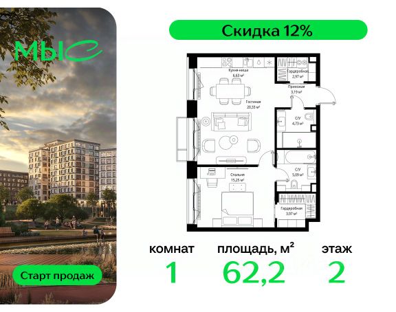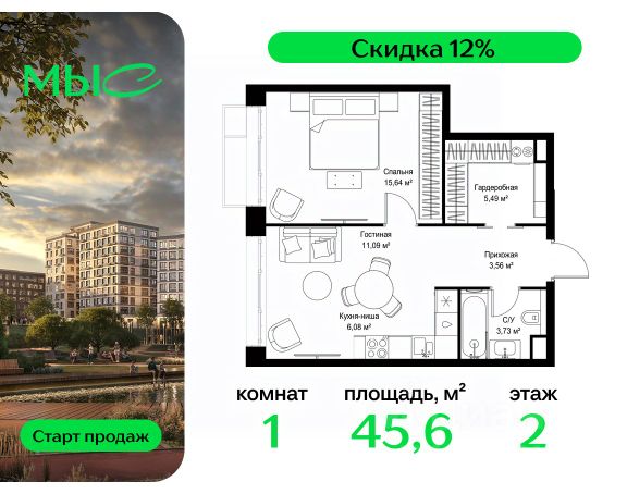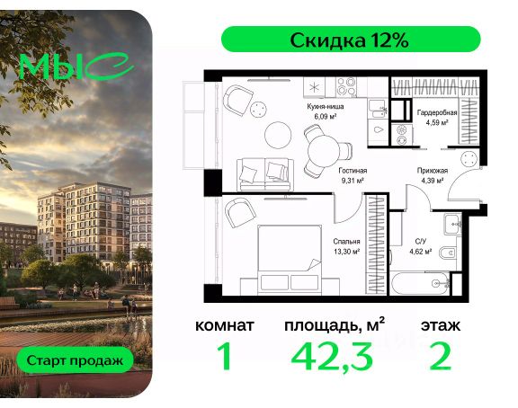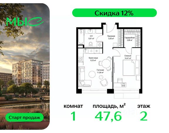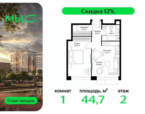 Прямая продажа от застройщика. Продаётся 1-комнатная квартира общей площадью 38.72 м² без отделки в премиальном жилом комплексе "МЫС" на 2-м этаже 12 этажного дома. Проект МЫС — это, прежде всего, идеальное место для семей. В рамках проекта построят государственную школу, два детских сада и дворец спорта площадью 20 000 м2 с термальным комплексом, выплывным бассейном, фитнес-залом, теннисными, сквош и падел кортами и секциями для детей. На территории площадью, сравнимой с тремя парками Зарядье, появятся кафе и рестораны, пруд с набережной, спортивные и детские площадки, скейт-парк, лыжные и веломаршруты. Расположение: - 2 минуты до скоростной трассы М1 и Минского шоссе; - 10 минут до МКАД; - 15 минут до МЦД Лесной Городок - 20 минут до делового центра "Москва-Сити"; - 28 минут до аэропорта "Внуково". Благоустройство: - велосипедные и лыжные маршруты; - собственная набережная и парк; - лаунж-зоны в окружении природы; - беседки у очага; - дворец спорта площадью 20 000 м²; - термальный комплекс с тремя бассейнами; - 4 теннисных и падел-корта; - 6 сквош-кортов; - многофункциональный спортзал; - скейт-парк; - просторная площадь для прогулок с фонтаном; - детский Клуб с творческими секциями; - гастро-доминанта; - кафе у пруда, рестораны, ритейл. Окружение - соседство с лесным фондом; - школа на 1250 мест и 2 детских сада на 350 и 255 мест; - Дубковский и Подушкинский леса, парк "Рассказовка", Мещерский парк. Действуют специальные условия при 100% оплате, подробности уточняйте у менеджера в офисе продаж.