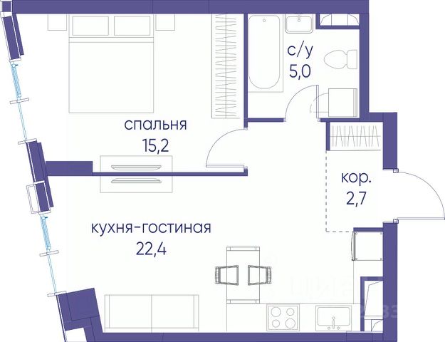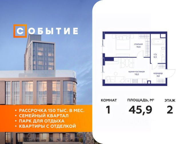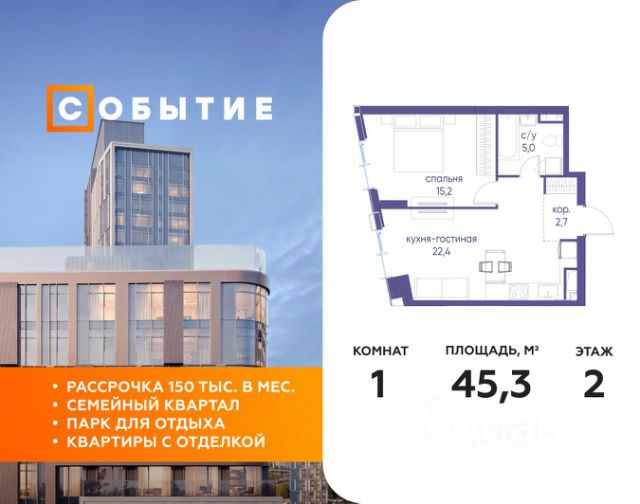 В продаже 1-к квартира от застройщика. Общая площадь 43.00, жилая 15.50, кухня 19.5. Квартира расположена на 2 этаже жилого квартала "Событие-6", корпус 1, Секция 1. Квартира без отделки. Срок сдачи: 4 кв. 2029 года. СОБЫТИЕ.6 — финальный дом парк-квартала СОБЫТИЕ на Мосфильмовской. Переезжайте в уже сформированный квартал с готовой инфраструктурой и парком! Премиальный жилой комплекс в престижном районе Москвы предлагает стильную архитектуру, продуманное благоустройство и великолепно разнообразие общественных пространств. Свой парк прямо возле дома! Архитектура Архитектура СОБЫТИЯ.6 выполнена в ультрасовременном стиле московским бюро Atrium на основе дизайн-кода британских архитекторов LDA Design и UHA London. Дом отличает оригинальная геометрия фасадов, большое остекление и высокие лобби (до 6,2 м) с авторской мебелью и светильниками. Расположение Мосфильмовская улица (Раменки) — один из престижных районов Москвы. Близость к историческому и деловому центру, природным зонам Запада столицы. Транспортная доступность: • 10 мин до Москва-Сити и ТТК; • 15 мин до Садового кольца; • 25 мин до аэропорта Внуково; • 7-10 мин до станций метро "Аминьевская" и "Мичуринский проспект". Инфраструктура: • парк "Событие" (12 га, финалист конкурса Правительства Москвы) с беговыми (1,5 км) и велодорожками (2,7 км), экотропой (1,6 км), площадками, лекторием; • школа, детский сад, магазины, салоны красоты, рестораны (к моменту заселения); • мультидвор с игровыми и спортивными площадками, мини-бульваром; • общественная терраса на 10-м этаже (коворкинг, лаунж); • Закрытые общественные пространства: детская комната, спортивный зал, коворкинг, лаунж-зоны. Паркинг 256 мест для жителей (48 — для электромобилей), 24 гостевых (5 — для электромобилей), мойки колес, кладовые, зоны для велосипедов. Окружение Парки и заповедники (Воробьёвы горы, Матвеевский лес и др.), МГУ, театр им. Н. И. Сац, стадион "Лужники". Безопасность Видеонаблюдение, контроль доступа, видеодомофоны, консьерж-сервис 24/7, системы пожарной безопасности и мультисервисная оптическая сеть.