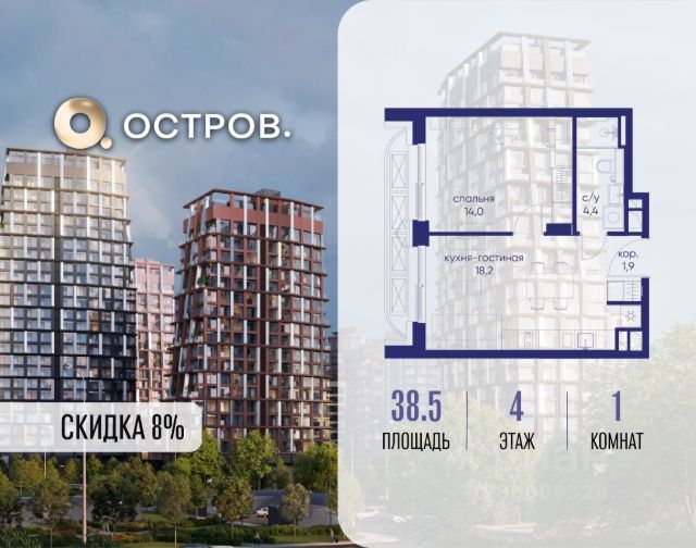 Скидка до 8% действует до 31.03.2026 г. при 100% оплате и не субсидированной ипотеке. Продаётся 1-комн. квартира от застройщика: общая площадь 38.50 м², жилая 14.00 м², кухня 18.20 м², 4-й этаж, жилой квартал "Остров 14", корпус 1 (секция 2). Срок сдачи: 2 квартал 2029 года. 1 совмещенный санузел. Остров.14 ДОХОДНЫЙ ДОМ - ЧАСТЬ ПРОЕКТА "ОСТРОВ", В 10 МИНУТАХ ОТ МОСКВА-СИТИ, В 15 МИНУТАХ ЕЗДЫ ОТ САДОВОГО КОЛЬЦА. Квартиры для сдачи в аренду Инвестиционный продукт для получения постоянного дохода Квартиры с отделкой и мебелью, и с управлением "под ключ" Постоянный доход для инвесторов, отельный сервис для арендаторов Востребованные для аренды планировки: студии, 1- и 2-комнатные квартиры 28-64 м2 Полная комплектация квартир: отделка, мебель, бытовая техника, кондиционеры Постоянный поток арендаторов - 10 минут от Москва-Сити, 5 минут от метро "Мневники", самодостаточная инфраструктура в квартале и собственная клубная инфраструктура в доме, спортивный, рекреационный и деловой кластеры на территории ОСТРОВА
