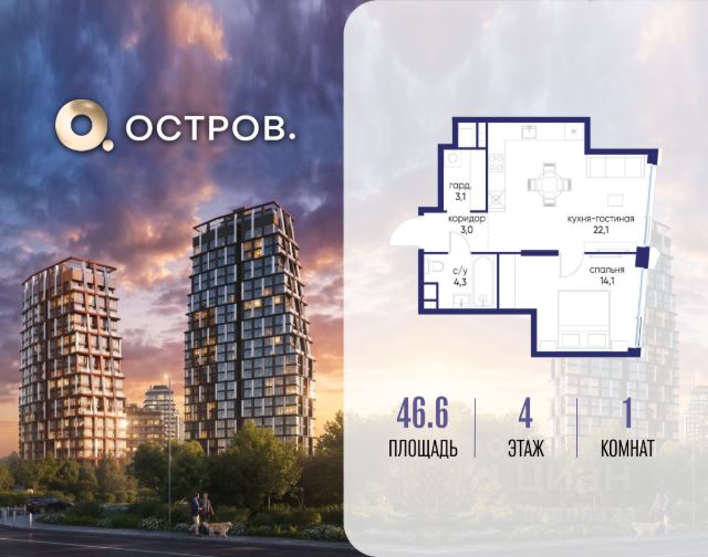 Продаётся 1-комн. квартира от застройщика: общая площадь 46.60 м², жилая 14.10 м², кухня 22.10 м², 4-й этаж, жилой квартал "Остров 14", корпус 6 (секция 1). Срок сдачи: 2 квартал 2029 года. 1 совмещенный санузел. Остров.14 - ЧАСТЬ ПРОЕКТА "ОСТРОВ", В 10 МИНУТАХ ОТ МОСКВА-СИТИ, В 15 МИНУТАХ ЕЗДЫ ОТ САДОВОГО КОЛЬЦА. Квартал расположен в северной части ОСТРОВА, у реки. Близость воды, благоустроенная набережная и курортная инфраструктура создают здесь отпускное настроение. Из окон квартир, с балконов и террас открываются великолепные виды на реку и московские пейзажи. Для семей с детьми предусмотрен дополнительный бонус: детский сад и школа в двух шагах от дома.