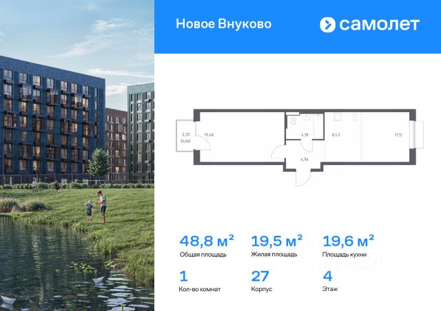 Предлагается 1-комнатная квартира комфорт-класса 46,94 кв.м в корпусе 34 на 4 этаже, в ЖК "Новое Внуково" Квартира с чистовой отделкой. Доступность дополнительных опций уточняйте у застройщика. Приобрести квартиру возможно по специальным акциям от застройщика, с текущими условиями акций можно ознакомиться в блоке "Акций". Цена динамическая и может отличаться, уточняйте актуальность у застройщика. "Новое Внуково" — это жилой комплекс в Новой Москве, у подножия берега реки Незнайка. Поблизости — живописные места для прогулок: народный парк "Ручеек", усадьба Старо-Никольское, Валуевский и Ульяновский лесопарки. Часть домов сдана и внутри района уже открыт детсад с бассейном, а в ближайшее время откроются еще 3 детсада, 2 школы и поликлиника. На территории проекта будет построен первый в России Центр Российской Федерации Баскетбола, где будут площадки с трибунами, тренажерный зал, кафе и конференц-зал. Дворы-парки закрыты от машин и посторонних. На территории — прогулочный маршрут вдоль реки Незнайка и набережная с шезлонгами и качелями для отдыха. Также здесь появится плейхаб "Незнайка на Луне", площадь для мероприятий с сухим фонтаном, летним кинотеатром и кафе. В жилом комплексе — монолитные дома высотой от 6 до 14 этажей. Фасады облицованы кирпичом природных оттенков.
