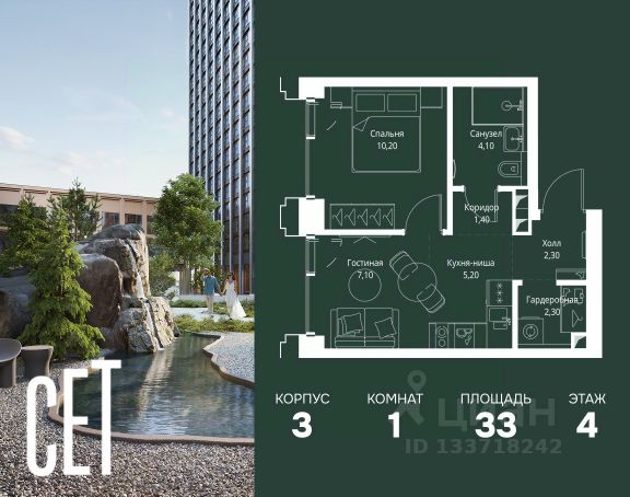 Прямая продажа от застройщика. В ЖК Сет продается 1-комнатная квартира площадью 41.40 м², расположенная в корпусе 3, на 4 этаже 45 этажного дома. Сет имеет стратегически выгодное расположение в ЗАО, в районе с большой историей и блестящим будущим: между природной зоной долины реки Сетунь и Кутузовским проспектом. В рамках возведения первой очереди предусмотрено три корпуса высотой 18, 45 и 59 этажей. На верхних этажах спроектированы общедоступные смотровые площадки с панорамным обзором на центр столицы. Преимущества проекта: • Функциональные планировочные решения • Контроль проникновения через входную дверь • Система управления освещением и температурой в квартире • Система защиты от протечек с функцией перекрытия воды • Вход в подъезд по биометрическим считывателям Face ID • Скоростные лифты • Двухуровневый подземный охраняемый паркинг на 495 машино-мест Застройка Сет включает в себя не только жилые корпуса, но и инфраструктурные объекты. Все необходимое для повседневного комфорта будет расположено в шаговой доступности: • Фитнес-Клуб с бассейном • Ведущая городская школа, детский сад и школа искусств • Центр культуры и досуга • Медицинский центр • Кафе и рестораны Расположение комплекса: Пешком: • Метро "Давыдково" - 17 минут • Парк "Долина реки Сетунь" - 3 минуты • Открытие новых станций метро в шаговой доступности в будущем Инфраструктура: Разнообразить свой день резиденты Веер смогут также проводя больше времени на свежем воздухе. Двор разделен на 4 зоны разных эмоций и действий, которые пересечены и соединены веерными прогулочными маршрутами: • Спортивная площадка устроена в глубине "Кленовой рощи" • В "Чайном домике" будет создан навес с утеплением для отдыха в любую погоду • Площадки для детей воплотятся в "Волшебный лес" с цветами, зеркалами и световым дизайном • "Центральная площадь" устроена у водного оазиса живописного пруда. На машине: • "Москва-Сити" - 15 минут • Садовое кольцо - 20 минут • ТЦ "Океания" - 8 минут • ТЦ "Времена года" - 13 минут • Сколково - 12 минут • Гребной канал - 17 минут Компания MR предлагает своим клиентам специальные условия приобретения квартир в рамках программ ипотечного кредитования от банков-партнеров.