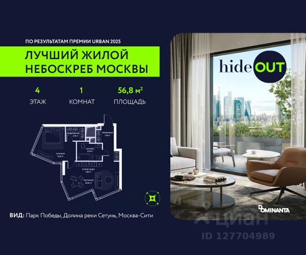 Прямая продажа от застройщика. Продается 1-комнатная квартира площадью 42,7 кв.м. на 4-м этаже 34-этажного дома в ЖК hideOUT с панорамными видами: Во двор. Высота потолков 3,25 м. hideOUT — премиальный проект компании Dominanta. Это новый уровень жизни и комфорта без компромиссов. Две башни — 34 и 49 этажей — открывают захватывающие виды на Москву. Архитектурной доминантой проекта становится мост, соединяющий башни на высоте 80 метров. Закрытая территория, охрана 24/7, зона экстренной безопасности на подземном уровне, система пожаротушения. На мосту между башнями на 22-м этаже находится SocialHUB — предусмотрено 16 комфортных пространств для работы, отдыха и развлечений с панорамными видами и клубным форматом доступа. Концепция благоустройства hideOUT — баланс между природой и технологичным городом будущего. На территории сада предусмотрены 15 зон для отдыха, работы, спорта и детей. Знаковым местом станет центральная площадь с амфитеатром и водопадом — сочетание камней, растений и струящейся воды создает идеальный баланс с природой. В проекте действуют привлекательные условия покупки: - семейная ипотека на старых условиях - успейте вдвое больше до 31.01.2026. - скидка до 20% при 100% оплате стоимости лота и ипотеке без субсидирования. Предложение действует до 31.01.2026. - рассрочка 0% на 3 года с первоначальным взносом от 20%. Период рассрочки до 36 месяцев. Застройщик АО "СЗ "ХАЙДАУТ", ИНН 7729058636, ОГРН 1027739319420. Проектная декларация на сайте наш.дом.рф. Предложение не является публичной офертой.