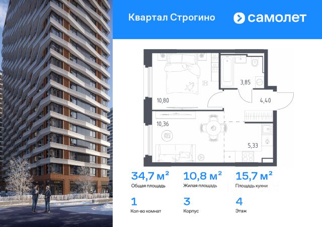 Строим кварталы для жизни с заботой о будущем. Предлагается 1-комнатная квартира комфорт-класса площадью 34,73 кв.м в корпусе 3 на 4-м этаже, в жилом комплексе "Квартал Строгино". В варианте без отделки мы установили окна и входную дверь, завели в квартиру коммуникации. Получайте ключи и начните создавать интерьер мечты в новой квартире. В варианте с предчистовой отделкой мы развели коммуникации по помещениям, выровняли и зашпаклевали стены, подготовили пол к чистовому покрытию. Ваша будущая квартира готова к финишному ремонту. Осталось выбрать, какие оттенки будут в вашем интерьере и воплотить дизайнерские идеи. В варианте с готовой отделкой мы поклеили обои под покраску, постелили полы в комнатах и санузлах, выполнили отделку стен. Установили сантехнику и межкомнатные двери, провели электрику. Это лучшее соотношение цены, качества и затраченного времени. Осталось только выбрать место для обеденного стола и удобного дивана. Приобрести квартиру возможно по специальным акциям от застройщика, с текущими условиями акций можно ознакомиться в блоке "Акций". Цена динамическая и может отличаться, уточняйте актуальность у застройщика. В жилом комплексе "Квартал Строгино" вас ждет широкий выбор досуга. Рядом МКАД и выезд на Новорижское шоссе и станции метро "Строгино" и "Мякинино". В пешей доступности — Живописная бухта, можно доехать до "Липовой Рощи" и "Серебряного бора". На территории комплекса будут 2 детских сада, школа и поликлиника. Двор-парк с площадками, велодорожками и паркингами. В лобби есть помещения для колясок. Квартиры с готовой отделкой и видом на бухту.