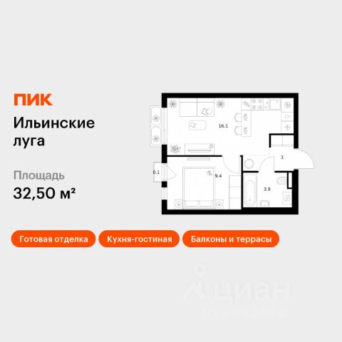 Продаётся 1-комн. квартира площадью 32,5 кв.м на 4 этаже 9 этажного дома (Корпус 3.5, Секция 5) проекта ПИК Ильинские луга. Светлый просторный подъезд на уровне земли, функциональная планировка, большие окна, c отделкой. Жилой район "Ильинские луга" находится в 10 километрах от МКАД по Новорижскому шоссе, в 20 минутах на автомобиле от станций метро "Волоколамская", "Тушинская" и "Строгино". В будущем ближе к проекту, в 9 минутах пути на машине, откроется станция "Ильинская" Рублёво-Архангельской линии, которая будет соединять Арбатско-Покровскую линию и Большую кольцевую линию. Сейчас в квартале начались продажи в корпусах 3.2, 3.3, 3.4, 3.5 и 3.6. "Ильинские луга" — масштабный проект, в который входит девять детских садов, четыре школы и поликлиника. Он строится в престижном и экологичном районе среди лесов и памятников природы. За 5 минут от жилого квартала можно доехать до Рублёво-Успенского шоссе, а за 30 минут — до центра Москвы. До крупного торгового центра "РИГАМОЛЛ" всего 5 минут на автомобиле, а до ТЦ "Твой дом" и гипермаркета "Глобус" — 10 минут. В "Ильинских лугах" строятся только девятиэтажные дома — такая архитектура соответствует спокойной жизни за городом. В каждом дворе-парке есть места для отдыха, детские и спортивные площадки. А ещё, здесь уже открыт большой PlayHub "Гравити" — современное игровое пространство с космической тематикой, холмами, зонами для игр и отдыха жителей любого возраста. На первых этажах уже работают магазины, кафе и пекарни. Места для отдыха от "Ильинских лугов" тоже недалеко: 10 минут на машине — и вы в музее-усадьбе "Архангельское". Также рядом находится Лохин остров — памятник природы, где водятся речные черепахи, есть места для кемпинга и возможность сплавиться по реке. Артикул 1001950 (Застройщик ООО "СЗ "ГРАДОЛИМП")