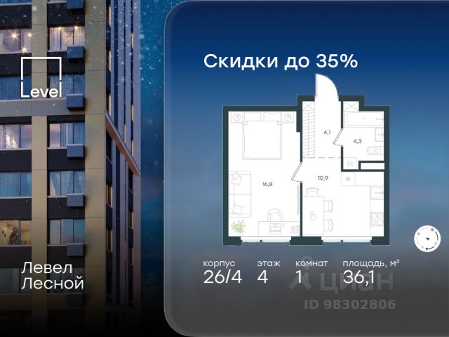 Цена указана с учётом скидки при 100%-й оплате, несубсидированной ипотеке, рассрочке (кроме программы "Рассрочка 0%"). В районе, утопающем в густой зелени лесов, многочисленных парков и скверов, продаётся 1-комнатная квартира площадью 36.10 кв.м с отделкой white box. Квартира расположена на 4 этаже в жилом комплексе комфорт-класса Левел Лесной (компания Level Group/Левел групп). Отличная транспортная доступность: - 25 мин. пешком до станции метро "Пятницкое шоссе"; - 28 мин. на автобусе до станции метро и МЦД-2 "Волоколамская"; - 11 мин. на авто до МКАД; - 25 мин. на авто до ТТК. Продуманный архитектурный проект: - Концепция проекта Левел Лесной от бюро СПИЧ; - Высотность комплекса до 15 этажей с уникальными видами на лесные массивы и город; - Высота потолков до 3 м; - Современные окна высотой до 1,6 м, в части квартир предусмотрены окна в пол. Высота подоконников 0,6 м; Расположение: Левел Лесной строится в зелёной зоне ближайшего Подмосковья, г.о. Красногорск в посёлке Отрадное. Шаговая и автомобильная доступность до метро и больших транспортных артерий города. За 25 минут вы дойдёте до станции метро "Пятницкое шоссе", а за 20 минут на машине сможете доехать до станции метро "Тушинская". Район окружен роскошной зеленью лесов и парковых зон, занимающих территорию свыше 1 000 гектаров. Помимо благоприятной экологии, здесь множество возможностей для активного отдыха и поддержания физической формы. Облагороженная территории с полностью развитой инфраструктурой. На территории проекта находится детский сад и школа "Светлые Горы", которая входит в список лучших частных школ от Forbes Education (по данным на 2023г.). Кроме того, в пешей доступности расположено ещё 8 детских садов, а также запланировано открытие современной муниципальной школы. В непосредственной близости находятся сетевые супермаркеты и локальные магазины, аптеки, клиники, почта, библиотека, салоны красоты, рестораны, спортивные и творческие секции, развивающие детские центры. В 12 минутах пешком расположен торговый парк "Отрада" с продуктовым и строительным гипермаркетами, магазинами, кинотеатром и развлечениями для детей. Внутренняя инфраструктура: Мы знаем, как важно, чтобы магазины и сервисы были всегда рядом. В сданных корпусах Левел Лесной уже расположена полностью готовая развитая инфраструктура. На первых этажах корпуса 27 предусмотрено ещё 14 коммерческих помещений. Благоустройство: Продуманное пространство и аура приватного европейского городка рождают чувство лёгкости и расслабления у каждого, кто попадает на территорию проекта. Концепцию общественных площадок разработали в партнёрстве два архитектурных бюро: Highlight Architecture и SCAPE. В безопасных дворах без машин каждый обязательно найдёт себе место для вдохновения, отдыха и спорта.