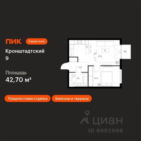Продаётся 1-комн. квартира площадью 44,5 кв.м на 4 этаже 32 этажного дома (Корпус 1.1.3, Секция 3) проекта ПИК Кронштадтский 9. Светлый просторный подъезд на уровне земли, функциональная планировка, большие окна, предчистовая отделка. Жилой квартал "Кронштадтский 9" возводится в Головинском — в одном из районов с лучшей экологией в Москве. Совсем рядом станция метро "Водный стадион" — до неё 3 минуты пешком. Поездка на машине до Ленинградского шоссе займёт 2 минуты, до ТТК — 10 минут, а до МКАД — 16 минут. Недалеко от жилого квартала находятся парки и пруды — спокойные места для прогулок и отдыха. В "Кронштадтском 9" можно купить квартиру в уже готовом корпусе и сразу получить ключи. В проект входит 10 корпусов с просторными и светлыми подъездами, два детских сада и подземный паркинг. Внутри квартала будут уютные дворы-парки с детскими площадками и местами для отдыха. А чуть дальше, чтобы шум не беспокоил жителей домов, мы построим спортивные площадки. Во всех квартирах в этом проекте предчистовая отделка, с которой легче реализовать ваши дизайнерские идеи. В районе, где строится "Кронштадтский 9", есть всё для комфортной жизни: школы, сады, вузы, магазины и крупные торговые центры "Водный" и "Метрополис". В 15 минутах ходьбы — парк у Головинских прудов, в 18 минутах — парк "Дружба". Оба для прогулок, пробежек и отдыха от дома и работы. Ключевая особенность новых корпусов проекта — это особый архитектурный образ, разработанный бюро М.А.М. Здания привлекают внимание контрастом светлых фасадных поверхностей с тёмными, более детализированными элементами. Архитектурные приёмы формируют связь с городским контекстом: низкоэтажные корпуса естественно вписываются в окружающий ландшафт, в то время как 32-этажная башня добавляет вертикальный акцент, усиливающий общий облик квартала. В "Кронштадтском 9" умные планировки: вы сами выбираете, как их использовать, чтобы ваша квартира была максимально комфортной именно для вас. Например, постирочная может стать студией звукозаписи, а зона для гардероба — кабинетом. В новых корпусах есть квартиры с кухней-нишей, сквозным санузлом и мастер-спальней с собственной ванной. Квартиры продаются с предчистовой отделкой. Это значит, что к моменту получения ключей в доме уже закончатся самые грязные и шумные работы, а вам будет легче реализовать дизайнерские идеи. Рядом с проектом есть всё необходимое. В паре минут пешком — торговые центры "Гавань" и "Водный", а в 7 минутах на машине — большой ТРЦ "Флотилия". В шаговой доступности аптеки и детская городская поликлиника. Доехать до взрослой поликлиники можно за несколько минут. Вокруг несколько интересных мест для прогулок, в том числе с детьми. Можно арендовать лодку или просто понаблюдать за плывущими яхтами и парусниками на Северном речном вокзале, побродить по парку возле усадьбы Грачёвки или сходить в музей охоты и рыболовства. Артикул 967565 (Застройщик АО "Специализированный застройщик МАК8")