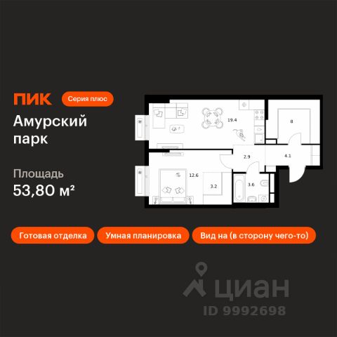 Продаётся 1-комн. квартира площадью 53,8 кв.м на 4 этаже 12 этажного дома (Корпус 4.2, Секция 2) проекта ПИК Амурский парк. Светлый просторный подъезд на уровне земли, функциональная планировка, большие окна, c отделкой. "Амурский парк" — проект "Серии плюс" на востоке Москвы, в 10 минутах пешком от станций метро "Черкизовская" и МЦК "Локомотив". В квартале будет всё для комфортной жизни: квартиры с готовой отделкой и видом на Измайловский парк, уютные дизайнерские лобби, подземный паркинг, торговые галереи на первых этажах и свой детский сад с бассейном. Всего в 8 минутах пешком от квартала "Амурский парк" находится уютный Сиреневый сад, а в 20 минутах — Детский Черкизовский Парк, за 10 минут можно доехать на машине до парка "Лосиный Остров". Квартал от мастерской M.A.M. отражает уникальный архитектурный почерк и органично дополняет городской ландшафт. В основе концепции — принцип сомасштабности человеку, благодаря чему внутри проекта формируется комфортное и гармоничное пространство для жизни. Квартал представлен разновысотными корпусами в минималистичном стиле. Образ строится на сочетании мягких пластичных линий и строгих геометрических форм. Рельефные детали в виде вертикальных металлических ламелей добавляют зданиям объём и глубину, делая архитектуру более выразительной. Цветовая гамма фасадов построена на контрасте терракотового и молочно-серого оттенков, которые создают атмосферу тепла и уюта. Магазины, рестораны и полезные сервисы на первых этажах создадут комфортное пространство для покупок, прогулок и встреч за чашкой кофе. Артикул 1020371 (Застройщик АО "СПЕЦИАЛИЗИРОВАННЫЙ ЗАСТРОЙЩИК "ГЛОРИ"")