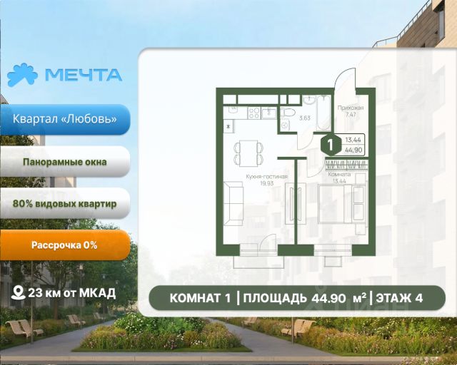 Продажа 1-комнатных квартир на 4 этаже рядом с метро Шереметьевская