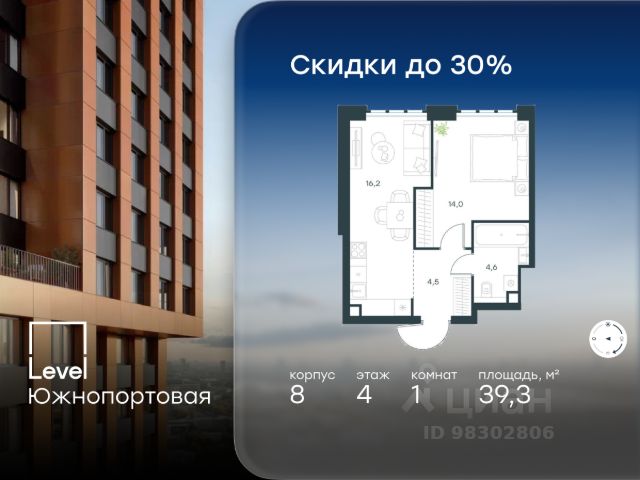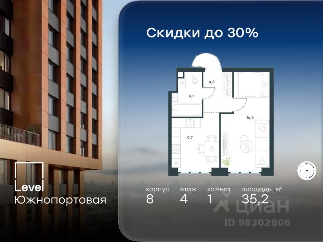 Указанная акционная стоимость доступна при 100% оплате или ипотеке без субсидирования. Цена действует до 31.12.2025 23:50:00. Стоимость без акции 21918600. Старт продаж! Продаётся 1-комнатная квартира от застройщика ГК "КОРТРОС" в жилом комплексе бизнес-класса ULTIMAcity. Квартира расположена на 4 этаже 45 этажного корпуса 1. Общая площадь 54,12 м². Без отделки. ULTIMAcity — жилой комплекс бизнес-класса в перспективном районе на юго-востоке Москвы. На его территории появятся 9 башен на 756 этажей, двухуровневый подземный паркинг, собственная инфраструктура, включая детский сад и школу. Всего девелопер благоустроит территорию в 2,6 га. Ближайшая станция метро — "Южный порт". Она откроется в 2028 году и будет находиться в 2-х минутах ходьбы. А прямо напротив расположится остановка водного автобуса-электрохода "Синичка". Дорога от квартала будет удобна и для автомобилистов: - до Кремля — 12 км - до МКАД — 12 км - до выезда на ТТК — 3 км - до Садового кольца — 8 км В двух корпусах первой очереди ULTIMAcity этажностью 45 и 52 реализуется 1 079 квартир с продуманными, рациональными планировочными решениями. В ассортиментной линейке представлены однокомнатные квартиры от 28,2 до 61 кв. м, двухкомнатные лоты от 44,3 до 95,4 кв. м, квартиры с тремя (71 — 115,57 кв. м) и четырьмя спальнями (106,6 — 114,97 кв. м). В экспозиции также есть квартиры с террасами, лоджиями, тремя и четырьмя санузлами, а также с функциональными нишами-кладовыми на кухнях. Запроектированы и эксклюзивные двухуровневые резиденции со вторым светом, в том числе с видом на Москву-реку, площадью от 77,7 до 141,9 кв. м. В рамках проекта запланировано строительство 9 корпусов, школы на 500 учащихся и детского сада на 225 мест. Еще будет создана продуманная инфраструктура для жителей: детские и спортивные площадки, амфитеатр для мероприятий, беседки и теплицы для садоводства, коворкинг, детский клуб и ресторан с открытой террасой. Доступ в жилой комплекс осуществляется по биометрическому контролю - Face ID. Вокруг квартала будет приватная территория с видеонаблюдением и консьерж-сервисом 24/7. Лобби корпусов будут иметь двойные выходы: на улицу и во внутренний закрытый двор.