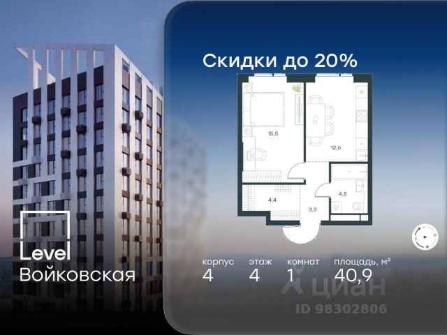 Цена указана с учётом скидки при 100%-й оплате, несубсидированной ипотеке, рассрочке (кроме программы "Рассрочка 0%"). Продается 1-комнатная квартира площадью 40.90 кв. м с отделкой. Квартира находится на 4 этаже 26-этажного корпуса 4, в новом жилом комплексе бизнес-класса Level Войковская, расположенном рядом с живописным заповедником "Покровское-Стрешнево" (застройщик - компания Level Group/Левел групп). Прекрасная транспортная доступность - 7 мин. пешком до станции МЦК "Балтийская"; - 15 мин. пешком до станции метро "Войковская"; - 8 мин. на машине до ТТК; - 15 мин. на машине до центра Москвы; - 20 мин. на машине до Москва-Сити. Продуманный архитектурный проект - стильная архитектура от мастерской Фефелова В. В.; - панорамные виды на парки, Химкинское водохранилище и Останкинскую башню; - лобби с высотой потолков до 6,45 метров; - более 20 видов планировочных решений, включая редкие форматы квартир с террасой и увеличенной высотой потолков до 5,42 метров; - 2 варианта дизайнерской отделки в корпусе 4, предлагаются как дополнительная опция к отделке white box: стиль Modern в светлых холодных тонах и стиль Classic в нейтральной бежевой гамме. Квартиры в корпусах 3 и 5 сдаются без отделки. Расположение Level Войковская строится в престижном Северном округе Москвы. Развитая инфраструктура и живописная природа переплетаются в единый ансамбль, столь значимый для комфортной жизни. Войковский район окружают парки и набережные. В шаговой доступности - парк "Покровское-Стрешнево", не более 15-ти минут на велосипеде занимает путь до Тимирязевского парка и 9-ти минут до парка усадьбы Михалково. Рядом более 60 школ, 75 дошкольных учреждений, 17 государственных и 6 частных вузов, 25 супермаркетов, 4 торговых центра, среди которых ТЦ "Метрополис" и ТЦ "Авиапарк". Внутренняя инфраструктура На территории жилого комплекса предусмотрены коммерческие помещения: кафе, ресторан, пекарня и другие сервисы откроются на первых этажах корпусов. Для жителей будет доступен отапливаемый подземный паркинг на 244 машино-места с доступом с любого этажа на лифте. На территории паркинга будет расположено 125 кладовых помещений для хранения сезонного инвентаря. Лобби и благоустройство Дизайн лобби Level Войковская создан совместно с бюро BLANK. Это уютные гостиные, где хочется задержаться. Теплая цветовая гамма, ресепшен, зоны ожидания, лапомойки и гостевые санузлы - каждая деталь превращает лобби в комфортное продолжение вашего дома. 1,15 га площади в первых двух этапах строительства отведено под приватный внутренний двор, который спроектирован совместно с бюро "Правда". Детские площадки для всех возрастов, спортивные пространства для йоги, воркаута и петанка, уютные зоны для тихого отдыха или работы. Здесь утро начинается с вдохновения, а вечер наполнен приятными моментами. Лифты Комфортное перемещение внутри жилого комплекса будут обеспечивать надёжные лифты с доступом в паркинг с жилых этажей. В каждом корпусе предусмотрено по 3 грузопассажирских лифта.