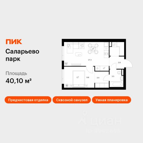 Продается однокомнатная квартира без отделки в 9 фазе города-парка "Первый Московский". Общая площадь квартиры - 34,6 кв. м, этаж 5 из 19. Срок сдачи - 2 квартал 2026 года. Тип дома - монолитный. Цена указана при 100% оплате. Город-парк "Первый Московский" расположен всего в 7 км по Киевскому шоссе (Новая Москва). Из города-парка есть удобный выезд на Киевское шоссе. ТРАНСПОРТНАЯ ДОСТУПНОСТЬ: - 5 мин. на личном автомобиле или 10 мин. на автобусе 189 и 876 до станции метро "Филатов Луг" - 20 мин. пешком до станции метро "Филатов Луг" ИНФРАСТРУКТУРА И БЛАГОУСТРОЙСТВО: 9 фаза сочетает в себе максимальную близость данной фазы строительства к парку Филатов луг. Основной акцент в благоустройстве сделан на разнообразные детские площадки и развивающие комплексы, с зонами для активного и спокойного отдыха взрослых. В доме предусмотрен подвальный этаж для кладовых помещений. В корпусе предусмотрено 2 коммерческих помещения свободного назначения на 1 этаже. АВТОРСКИЙ ДИЗАЙН: Входные группы выполнены по авторскому дизайну, оснащены системой "тёплый пол". В каждой входной группе будет располагаться комфортабельная зона ожидания. При входе предусмотрено помещение для хранения колясок и на -1 этаже располагается велопарковка.