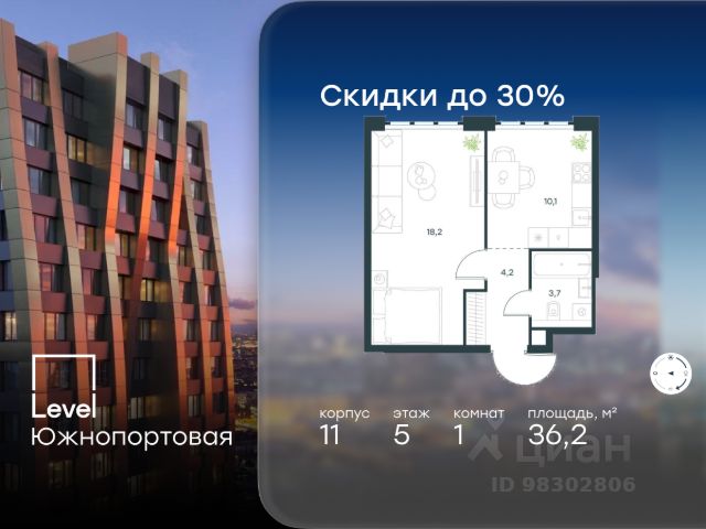 Цена указана с учётом скидки при 100%-й оплате, несубсидированной ипотеке, рассрочке (кроме программы "Рассрочка 0%"). В северной части района Печатники продается 1-комнатная квартира площадью 36.20 кв.м без отделки. Квартира расположена на 5 этаже 16-этажного корпуса 11 в жилом комплексе комфорт-класса Level Южнопортовая (компания Level Group/Левел групп). Отличная транспортная доступность: - 10 мин. пешком до станции метро "Кожуховская"; - 20 мин. пешком до станции МЦК "Дубровка"; - 3 мин. на авто до ТТК; - 13 мин. на авто до Садового кольца; - 15 мин. на авто до Бульварного кольца. Продуманный архитектурный проект: - авторская архитектура от бюро СПИЧ; - уникальные виды на реку, парки и достопримечательности города; - высота потолков в квартирах до 6 м; - окна высотой до 1,87 м с высоким коэффициентом сопротивления теплоотдаче. Расположение: Level Южнопортовая строится в северной части района Печатники - самой приближенной к центру. Здесь будет сформирован новый район "Южный порт", где построят крупный жилой и общественно-деловой центр, аналогичный Москва-Сити. В течение 10-12 лет в этом месте появятся не только жилые дома, но и развитая инфраструктура для жизни и работы. А еще совсем рядом находится набережная Москвы-реки, где планируется построить причалы для речных трамвайчиков и канатную дорогу. Уже сейчас вокруг жилого комплекса работают десятки магазинов и торговых центров, рядом расположено 6 парков, среди которых музей-заповедник "Коломенское". В 10 минутах пешком - 2 муниципальных и 2 частных детских сада, 7 общеобразовательных школ. Внутренняя инфраструктура: Для отдыха жителей в каждом корпусе предусмотрено лобби, оснащенное местами для отдыха, гостевыми санузлами и лапомойками, а в отдельных корпусах - камином. За счёт больших окон и высоких потолков пространства будут наполнены воздухом и светом. На первых этажах жилого комплекса откроются магазины, салоны красоты, фитнес-центр. Для детей строятся собственные детский сад и школа. Благоустройство: Внутренний двор комплекса разработан совместно с бюро GAFA. Основная идея - создать аналог Центрального парка в Нью-Йорке, гармонично сочетая высотные здания и большое изолированное парковое пространство. Вся площадь двора-парка будет огорожена и составит более 2 га, из которых 45% - озеленение. Одним из самых важных ландшафтных элементов здесь станет небольшая речка, наполняющаяся во время дождя. Вокруг неё появится сеть из островов, внутри которых расположатся тематические зоны спорта и отдыха. Технологии и инженерия: - автоматическая передача в управляющую компанию показаний квартирных счётчиков; - телефонная связь, телевидение и интернет на базе оптической мультисервисной сети; - гостевой Wi-Fi в лобби и на территории двора; - единый ключ доступа для входа на территорию комплекса.